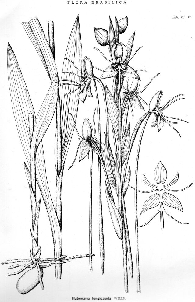 References W3 Tropicos, Kew Monocot list , IPNI ; Atlas des Orchidees Cultivees Constantin 1920 drawing ok; Flora Brasilica Vol XII I Hoehne 1940 drawing ok; Iconografia de Orchidaceae Do Brasil Hoehne 1949 drawing fide; Orchidaceae Brasilenses Band 1 Pabst and Dungs 1975 drawing The Orchids of Surinam Werkhoven 1986 as H longicauda ssp ecalacarata; The Orchids of Surinam Werkhoven 1986 photo fide; Inventaire Taxonomique des Plantas de la Guyane Francaise II Les Orquidacees Cremers & Hoff 1992; Flora of the Venezuelan Guayana Vol 7 Steyermark, Berry, Yatskievych and Holst 2003; +The genus Habenaria (Orchidaceae) in the Brazilian Amazon Joćo A. N. Batista; Joćo Batista F. da Silva; Luciano de Bem Bianchetti; Rev. bras. Bot. vol.31 no.1 Sćo Paulo Jan./Mar. 2008 drawing; Orchids of French Guiana Szlachetko, Veyret, Mytnik-ejsmont, Sawicka, Rutkowski and Baranov 2012 as Kusibabella longicauda drawing fide; Orchids of French Guiana Szlachetko, Veyret, Mytnik-ejsmont, Sawicka, Rutkowski and Baranov 2012 as Kusibabella longicauda var ecalcarata; AOS Bulletin Vol 85 #3 2016 drawing fide; Orquideas Tesoro de Colombia Vol 2 Ortiz & Uribe 2017; Materials to the Orchid Flora of Colombia Vol 1 Szlachetko & Kolanowska 2017 as Kusibabella longicauda drawing/photo fide; Materials to the Orchid Flora of Colombia Vol 1 Szlachetko & Kolanowska 2017 as Kusibabella longicauda var ecalcarata