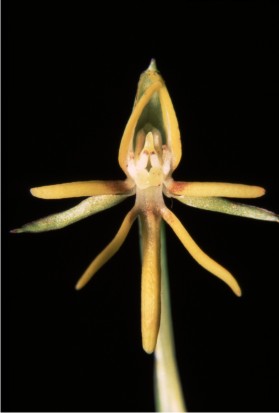 Found in Guyana, Fr Guiana, Surinam and northern and central Brazil in open grasslands at elevations up to 1000 meters as a small sized, hot to warm growing terrestrial with a oblong, subterranean tuber giving rise to an erectslender, delicate stem carrying 2 to 10, remotely spaced, larger below, erect-patent, linear, acute, basally clasping leaves grading above to 3 remotely spaced, ovate bracts that blooms in the later spring on a terminal, erect, 1.6 to 2.4" [4 to 6 cm] long, distantly 1 to 2 flowered inflorescence with ovate, acute, as long as to shorter than and clasping the ovary floral bracts and carrying glabrous flowers.