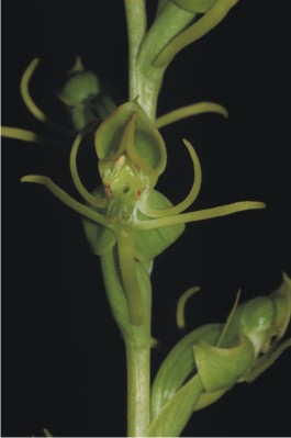 Found in Bahia and Minas Gerais states of Brazil in the Chapada Diamantina at elevations of 640 to 1600 meters as a small sized, warm to cool growing terrestrial with an erect, leafy stem carrying towards the middle largest, decreasing in size above and below, linear to linear-lanceolate, clear green leaves that blooms in the summer and earlier fall on a terminal, erect, racemose, to 4.8" [12 cm] long, laxly to 20 flowered inflorescence carrying green to yellow green flowers.