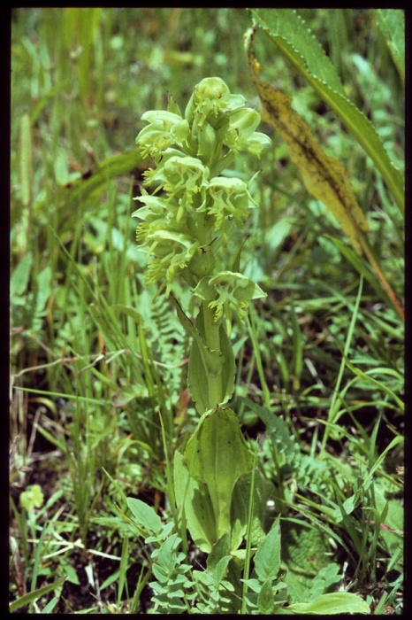 Found in southwestern Tanzania in upland grasslands at elevations of 2100 to 2700 meters as a small to medium sized, cold growing terrestrial with ellipsoid, tomentose tubers giving rise to an erect, leafy stem carrying 5 to 8, lowermost 1 to 2, sheathlike, the rest suberect, lanceolate to ovate-lanceolate, acute to obtuse, grading towards the apex to bract-like leaves that blooms in the summer? on an erect, 2.8 to 7.6" [7 to 19 cm] long, rather densely to 20 flowered inflorescence