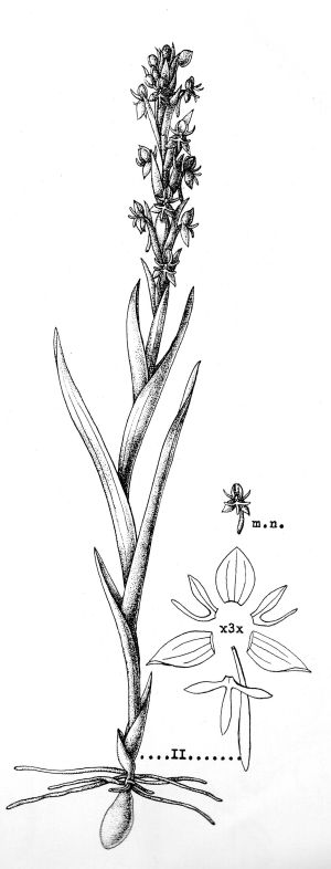Found in Rio Grande do Sul state of Brazil and Uruguay as a miniature to medium sized, cold growing terrestrial with a short, thin, obscurely angled, leafy stem carrying linear-lanceolate, acuminate, basally clasping, erect-patent, 3 nerved leaves that blooms in the summer terminal, erect, 1.6 to 3.2" [4 to 8 cm] long, many flwoered inflorescence with ovate-lanceolate, acuminate, as long as the ovary floral bracts and carrying small, erect-patent, more or less greenish flowers.