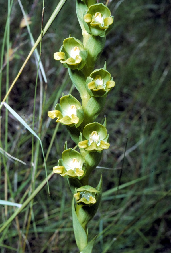 Found in southwestern India in grasslands at elevations around 2000 meters as a medium sized, cool to cold growing terrestrial with 1 to 2 oblong tubers giving rise to an erct stem enveloped towards the base by 4 to 5 tubular sheaths, carrying towards the middle 5 to 7, lanceolate-ovate, amplexicual, acute- acuminate leaves taht blooms in the late summer and fall on an erect, terminal, racemose, to 5.6" [14 cm] long, secund, several flowered inflorescence with large, cucullate, foliaceous, imbricate, broadly ovate, acute, shortly acuminate, progressively shorter above, as long as the ovary floral bracts and carrying yellow green, large flowers.