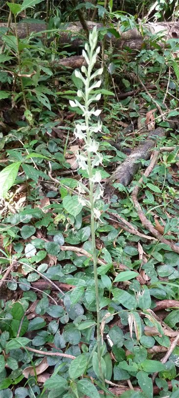 Found in Sierra Leone, Liberia, Ivory Coast, Ghana, Nigeria, Cameroon, Equatorial Guinea, Central African Republic, Gabon and Zaire in forests with a creeping rhizome, giving rise to an erect, delicate, glabrous stem carrying 3 to 9, gathered a=towards the base or along the stem, oblanceolate, obovate, rarely lanceolate to broadly lanceolate, acute to shortly acuminate, spreading, petiolate base leaves and with 3 to 4, ovate-lanceolate, acute, adpressed to the stem, glabrous cauline bracts above that blooms at most any time of the year on an erect, terminal, 1.2 to 8" [3 to 20 cm] long, lax or dense, 6 to 20 flowered inflorescence with small, white, green or pinkish flowers