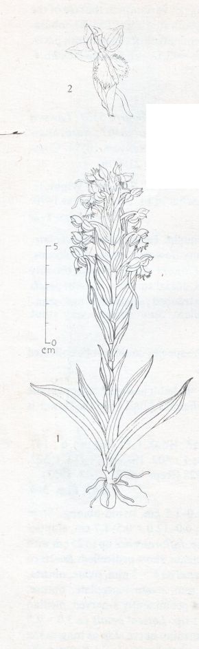 Found in southern India in the Nilgiri Hills at elevations of 2000 to 2500 meters as a miniature to small sized, cold growing terrestrial with an oblong tuber giving rise to an erect, short, stout leafy stem carrying 3 to 7, ovate-lanceolate, acute-acuminate, basally clasping leaves abruptly grading to bracts above that blooms in the late summer and early fall on a terminal, erect, to 4" [10 cm] long, densely many flowered inflorescence with foliaceous, cymbiform, lower one langer than the ovary floral bracts and carrying white flowers
