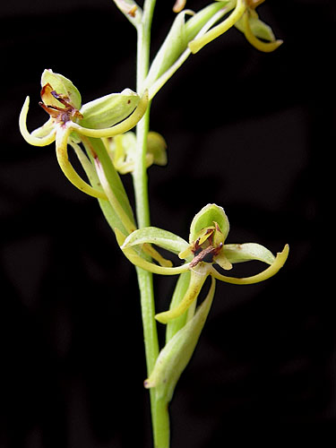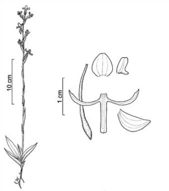 Found in Minas Gerais Brazil at elevations around 1100 meters as a small sized, cool growing terrestrial with an inconspicuous stem carrying 5 to 6, basal, rosulate, sessile, membraneous, narrowly elliptic, acuminate leaves that blooms in the late summer and early fall on a terminal, erect, peduncle to 8" [20 cm] long, to 82.4 to 83.5" [26 to 28.5 cm] long overall, laxly several flowered inflorescence