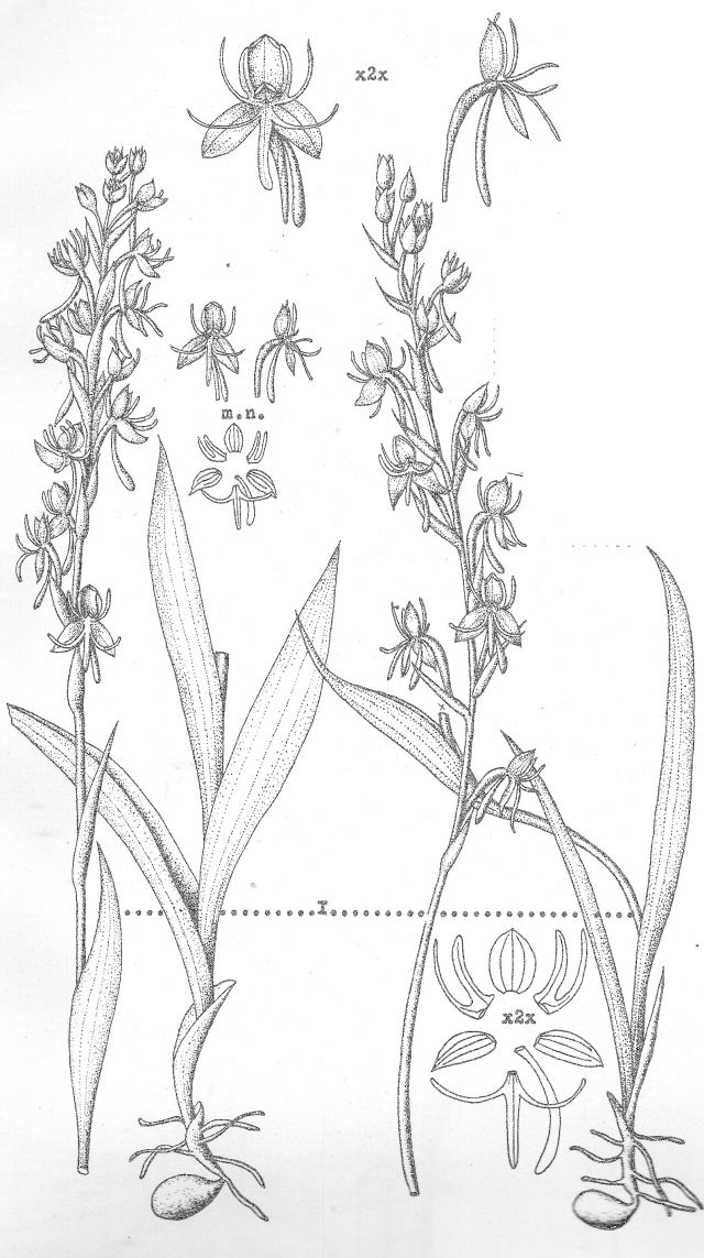 Found in Minas Gerias state of Brazil on embankments and in rocky grasslands as a medium sized, cool growing terrestrial with a thin, erect stem enveloped by imbricating, leafbearing sheaths grading larger above, linear-lanceolate to ovate-lanceolate, acute to acuminate, amplexicaul and basally clasping leaves that blooms in the late spring and early summer on a terminal, erect, slightly sinuous, 4 to 8" [10 to 20 cm]long, many flowered inflorescence.