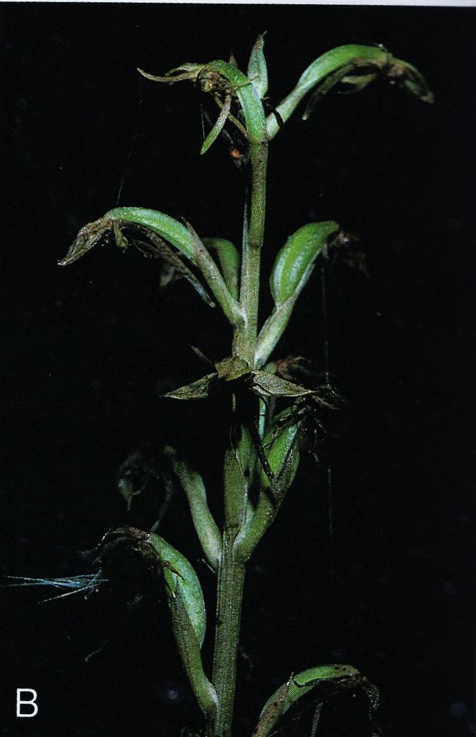 Found in Samoa in lowlands and cloud forests at elevations of 200 to 1550 meters as a medium sized, hot to cool growing terreestrial with an erect stem carrying elliptic-lanceolate to obovate, acuminate leaves at the center of the stem that blooms on a terminal, erect, 10 to 13.2" [25 to 33 cm] long, laxly to subdensly many flowered inflorescence with lanceolate, acuminate floral bracts and carrying green flowers.