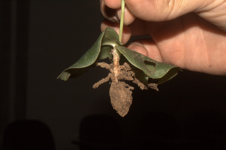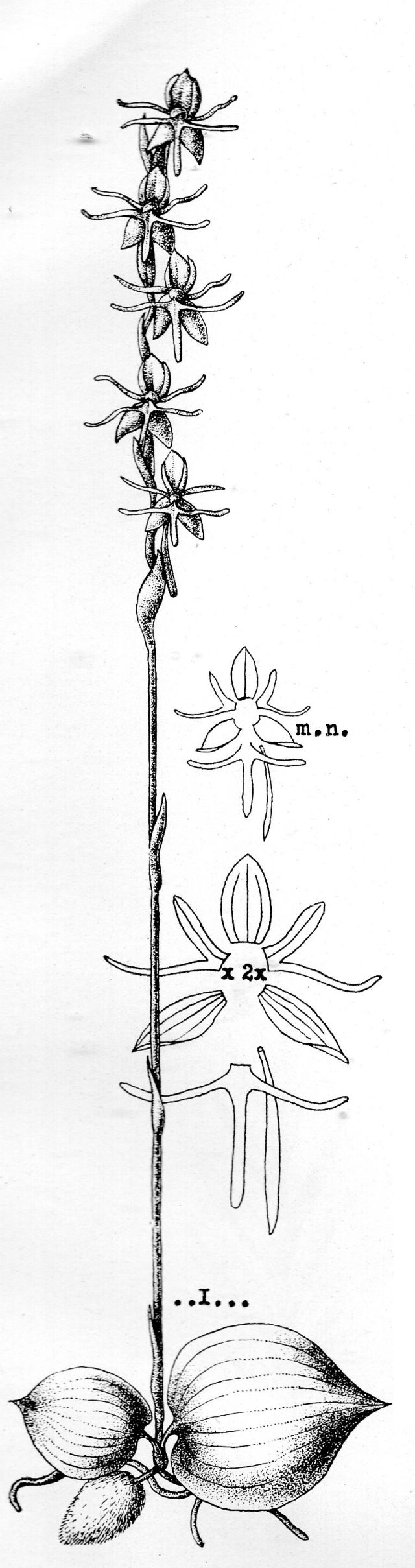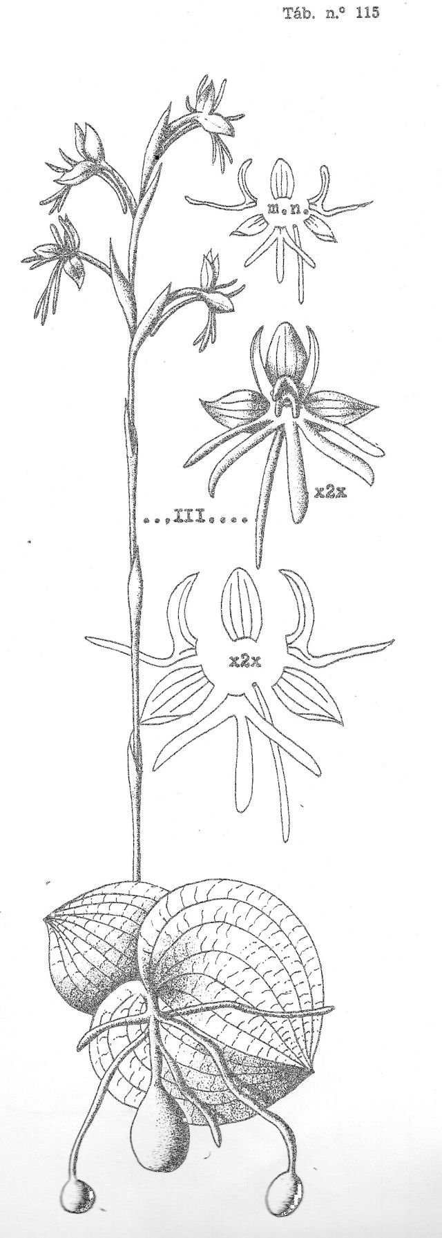 Found in Brazil and northern Argentina as a miniature sized, cold growing terrestrial with an almost globose to ellipsoid tuber giving rise to 2 basal, almost opposite, oblong-orbicular, sessile, rounded to slightly acute apically leaves that blooms in the late fall on an erect, 2.8 to 8.8" [7 to 22 cm] long, few flowered inflorescence with lanceoalte, acuminate shorter than to as long as the ovary floral bracts and carrying clear green flowers.
