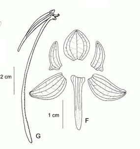 +"In the length of the spur H. seticauda is similar to H. hamata, and we first suspected they were conspecific. Accordingly, material of H. hamata from French Guiana (Cremers & Hoff 10717) was identified by Renz (1992) as H. seticauda. However, examination of material from Venezuela and Roraima in Brazil showed that H. seticauda is a distinct entity and in fact very similar to H. obtusa. The two taxa differ basically in the length of the spur, which is longer in H. seticauda (8-9 cm) than in H. obtusa (3-5 cm). Besides this, the only other difference is that H. seticauda is restricted to the Guianas shield while H. obtusa has a broad distribution. Considering the differences above, we prefer to keep the two entities as separate species, although the collection of material (G. Eiten & L. Eiten 3869 SP) with spurs of intermediate length (6-7 cm) at the state of Maranhćo suggests that the separation of the two entities at the species level may not be justifiable. This is the first confirmed report of the species in Brazil, and other previous reports (Hoehne 1940, Pabst & Dungs 1975, Silva et al. 1995, Silva & Silva 2004) were based in misidentification. The lateral sepals are green, the dorsal sepal is white with a green base, petals are white and the lip is green with a white base. The spur has a white base and becames green towards the apex. The species occurs in open dry places or at the border of forests.