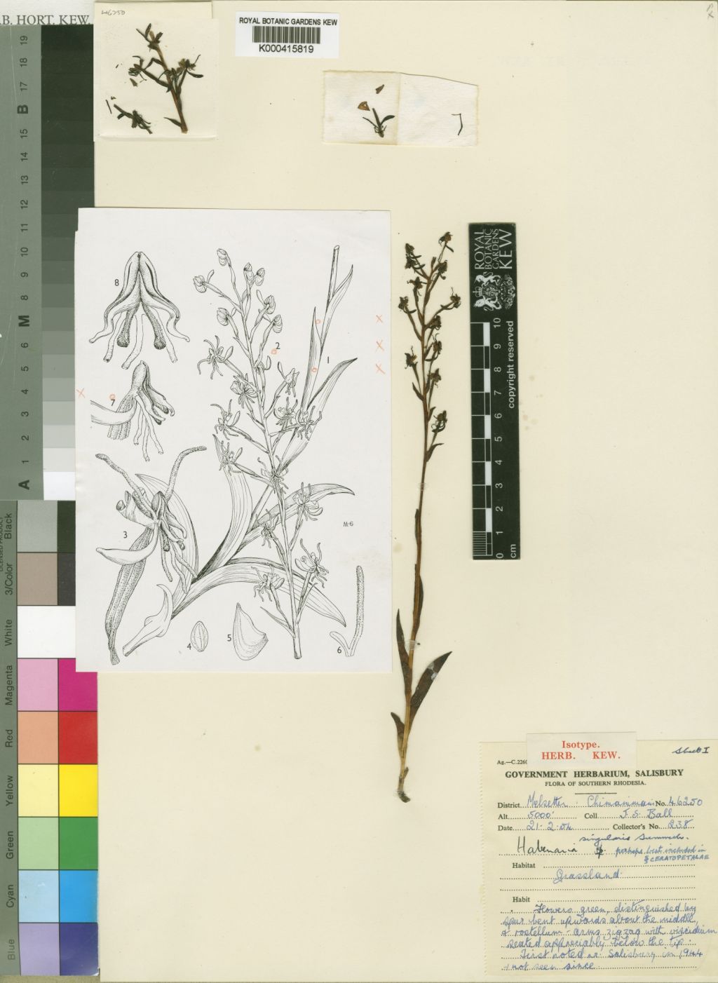 Found in Zimbabwe in montane grasslands at elevations around 1500 meters as a small to medium sized, cool growing glabrous terrestrial with a stem carrying 6 to 11, the lowermost 1 to 2, sheathlike, the middle 3 to 7, recurved, lanceolate to oblong-lanceolate, acute and the upper leaves grading into bracts that blooms in the later summer on a terminal, erect, fairly lax, 4 to 25 flowered inflorescence