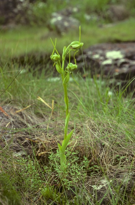 Found in Zaire, Rwanda, Burundi, Tanzania, Angola, Malawi, Zambia and Zimbabwe in marshy grasslands, seepage areas amongst rocks and woodlands at elevations of 1000 to 2250 meters as a small to medium sized, cool to cold growing terrestrial with ovoid to ellipsoid, woolly tubers giving rise to an erect, leafy stem carrying 5 to 11, the lowest 1 to 2 sheathing, the next few suberect to spreading, lanceolate, acute, the uppermost grading into bract-like leaves that blooms in the spring and summer on an erect, 2 to 10.4" [5 to 26 cm] long, 3 to 17 flowered inflorescence.