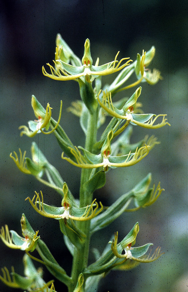 This species and H multipartita are very similar but this orchid usually comes from higher altitudes and generally is a much larger plant with a to 8" longer rachis and up to 50 flowered inflorescence. This species also has a pinched hood while H multipartita has a wide open hood and this species has a side lobe of the lip that has a main branch that has filiform side branches all emanating from the same side much like a comb has.