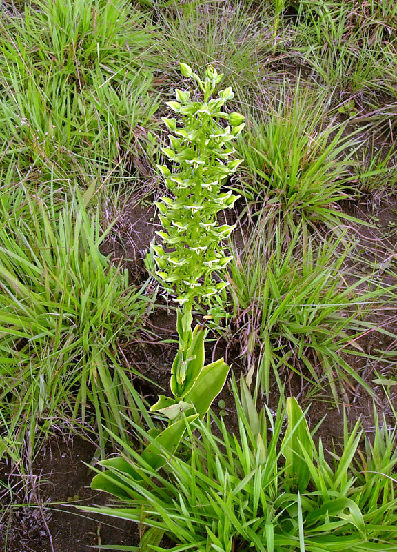 Found in Zaire, Tanzania, Malawi, Zambia and Zimbabwe in upland grasslands or swamps at elevations of 1800 to 2400 meters as a large sized, cool to cold growing terrestrial with ovoid to ellipsoid tubers giving rise to an erect, leafy stem with the lowermost 1 to 2 being sheath like and the middle ones suberect to spreading, broadly lanceolate, loosely clasping stem at the base, the upper ones grading into bracts that blooms in the late summer and early fall on an erect, 4 to 9.6" [10 to 24 cm] long, densely many flowered inflorescence carrying leafy, shorter than the flowers floral bracts.