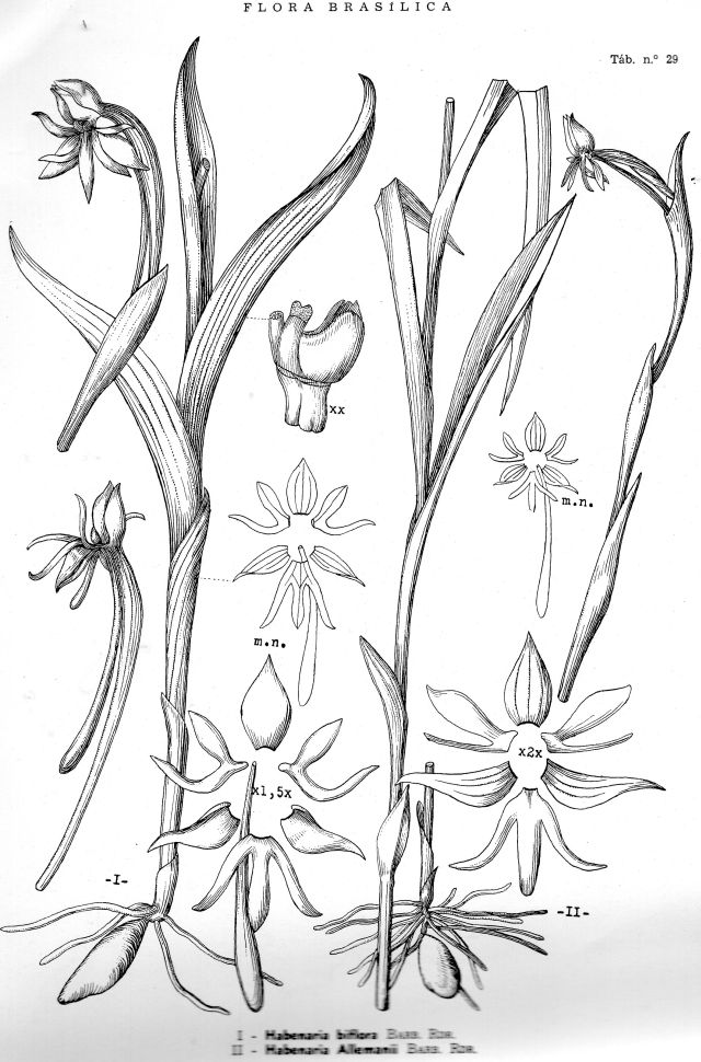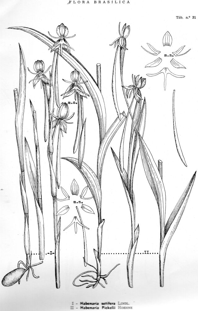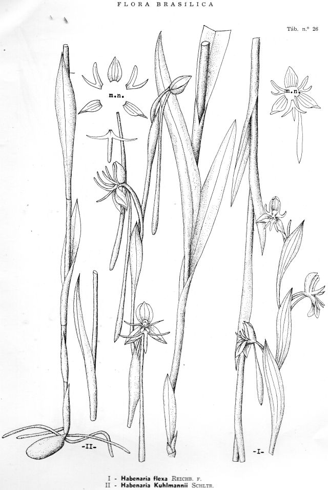 References W3 Tropicos, Kew Monocot list , IPNI ; Bonplandia Rchb.f 1853/4 as H spathacea; Symbolae Antillanae Vol VI Orchidaceae Urban 1909 as H setifera; Studies in the Family Orchidaceae Vol 4 Ames 1910 as H setifera drawing good; Die Orchideen der Sudamerikanischen Kordillerenstaaten I Venezuela Schlechter 1919 as H caracasana; Repert. Spec. Nov. Regni Veg. Beih. 7: 38 Colombia Schlechter 1920 as H setifera; Repert. Spec. Nov. Regni Veg. Beih. 7: 38 Colombia Schlechter 1920; Repert. Speciorum Novarum Regni Vegetabilis Band VIII Peru Schlechter 1921 as H setifera; Repert. Sp. Nov. Regni. Veg. Beih. 19: 272. Costa Rica Schlechter 1923 as H endresiana; Flora Brasilica Vol XII I Hoehne 1940 drawing fide; Flora Brasilica Vol XII I Hoehne 1940 as H curti-bradei drawing ok; Flora Brasilica Vol XII I Hoehne 1940 as H flexa drawing ok; Flora Brasilica Vol XII I Hoehne 1940 as H kuhlmannii drawing ok; Flora Brasilica Vol XII I Hoehne 1940 as H pauciflora drawing ok; Flora Brasilica Vol XII I Hoehne 1940 as H allemanii drawing ok; Flora Brasilica Vol XII I Hoehne 1940 as H duckeana drawing ok; Flora Brasilica Vol XII I Hoehne 1940 as H setifera drawing ok; Flora Brasilica Vol XII I Hoehne 1940 as H pickelii drawing ok; Flora Brasilica Vol XII I Hoehne 1940 as H gehrtii drawing ok; The Orchids of Panama L.O. Williams & P Allen 1946 as H pauciflora; Orchids of Guatemala Ames & Correl 1952 as H pauciflora; Orchids of Peru Vol 1 Schweinfurth 1958 as H pauciflora; Drawings of Florida Orchids Blanche Ames 1959 as H setitifera dawing fide; Native Orchids of Trinidad Schultes 1960 as H pauciflora; Venezuelan Orchids Illustrated Vol 2 Dunsterville & Garay 1966 drawing fide; AOS Bulletin Vol 38 No 6 1969; Flora de Venezuela Volumen 15 Parte 1 Foldats 1969 as H angustifolia; Flora de Venezuela Volumen 15 Parte 1 Foldats 1969 as H pauciflora Rchb.f drawing fide; Flora de Venezuela Volumen XV Parte 1 Lasser/Foldats 1969; Fieldiana, Orchids of Peru 1st Supplement to Schweinfurth 1970; Die Orchideen 3 Auflage Bd 1 Sonderabdruck aus Schlechter Lieferung 4 193 to 256 Brieger, Maatsch and Senghas 1973; Las Orquedias De El Salvador Vol 1 Hamer 1974 drawing ok; Orchidaceae Brasilenses Band 1 Pabst and Dungs 1975 as H allemanii drawing good; Orchidaceae Brasilenses Band 1 Pabst and Dungs 1975 as H biflora; Orchidaceae Brasilenses Band 1 Pabst and Dungs 1975 as H curtiibradei drawing good; Orchidaceae Brasilenses Band 1 Pabst and Dungs 1975 as H kuhlmannii drawing ok; Orchidaceae Brasilenses Band 1 Pabst and Dungs 1975 as H pickelii drawing good; Orchidaceae Brasilenses Band 2 Pabst & Dungs 1977 as H biflora drawing fide; Flora of Ecuador No 9 225[1] Garay 1978; Orchids of Venezuela, An Illustrated Field Guide Vol 2 Dunsterville & Garay 1979 drawing fide; Las Orquedias de El Salvador Vol 3 Hamer 1981 drawing fide; Icones Planetarum Tropicarum Plate 771 Hamer 1982 drawing ok; Orchids of Guatemala and Beliz Ames & Correll 1985; Flora Novo Galaciana McVaugh 1985; The Orchids of Surinam Werkhoven 1986; Native Orchids of the Eastern Caribbean Kenny 1988 as H pauciflora photo fide; Orchids from The Coast Of Ecuador Arosemana, Jurado, Estrada and Konanz 1988; Selbyana Vol 10 Orchids of Central America Hamer 1988 drawing fide; Inventaire Taxonomique des Plantas de la Guyane Francaise II Les Orquidacees Cremers & Hoff 1992; Field Guide to the Orchids of Panama and Costa Rica Dressler 1993; Orchids of Venezuela [An illustrated field guide] Vol. 2 Ramiro and Carnevali 2000 drawing fide; Ecuadorian Native Orchids Vol 2 Dodson 2001 photo ok; Flora of the Venezuelan Guayana Vol 7 Steyermark, Berry, Yatskievych and Holst 2003; Manual de Plantas de Costa Rica Vol III Hammel, Grayum, Herrera and Zamora 2003; Orchids of Mexico Hagsater, Soto, Salazar, Jimenez, Lopez & Dressler 2005; The Organ Mountain Range, its History and its Orchids Miller, Warren, Miller & Seehawer 2008 drawing hmm/photo good; Orchid Species of Peru Zelenko Bermudez 2009 photo fide; Guia de Orquideas de Chiapas Carlos Rommel Beutelspacher Baigts 2013; Orchids of French Guiana Szlachetko, Veyret, Mytnik-ejsmont, Sawicka, Rutkowski and Baranov 2012 as Rhinorchis pauciflora; Orchids of French Guiana Szlachetko, Veyret, Mytnik-ejsmont, Sawicka, Rutkowski and Baranov 2012 as Rhinorchis trifida drawing fide; Orquidees du Bresil As Orquideas sa Serra do Castelo Vol 1 Chiron & Bolsanello 2015 photo/drawing fide; Orquideas Tesoro de Colombia Vol 2 Ortiz & Uribe 2017 Drawing/photo fide; Materials to the Orchid Flora of Colombia Vol 1 Szlachetko & Kolanowska 2017 as Rhinorchis trifida drawing/photo fide; Orchid Genera and Species in Guatemala Archila, Szlachchetko, Chiron, Lipinska, Mystkowska and Bertolini 2018 as Rhinorchis trifida; Lankesteriana 19(3) 2019 as Habenaria kuhlmannii drawing fide