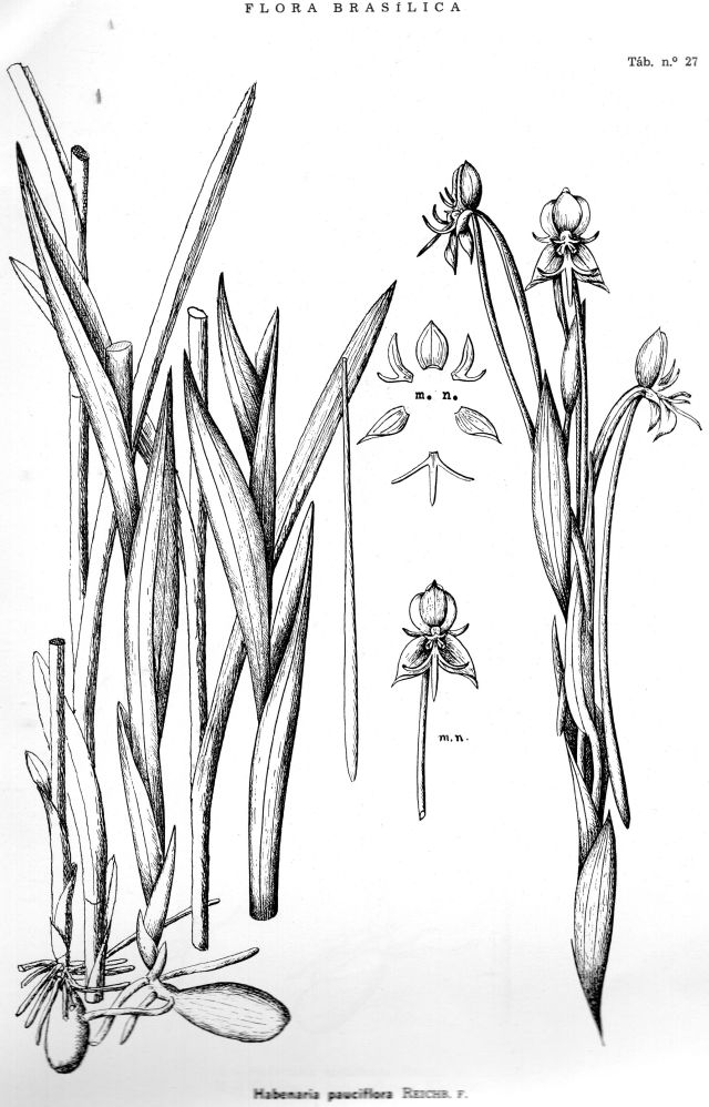Synonyms Bonatea pauciflora Lindl. 1835; Habenaria allemanii Barb.Rodr. 1881; Habenaria angustifolia Kunth 1816; Habenaria caracasana Schltr 1919; Habenaria curti-bradei Hoehne 1937; Habenaria dentirostris Pabst 1955; Habenaria duckeana Schltr. 1925; Habenaria endresiana Schltr. 1923; Habenaria flexa Rchb.f. ex Kraenzl. 1893; Habenaria flexa var. rodriguesii Cogn. 1893; Habenaria flexuosa Rchb.f. 1965; Habenaria gehrtii Hoehne & Schltr. 1921; Habenaria hoehnei Schltr. 1921; Habenaria kuhlmannii Schltr. 1925; Habenaria pauciflora (Lindl.) Rchb.f. 1854; Habenaria pickelii Hoehne 1937; Habenaria setifera Lindl. 1839; Habenaria spathacea A.Rich. & Galeotti 1845; Orchis longicornu Salzm. ex Lindl 1835; Rhinorchis kuhlmannii (Schltr.) Szlach. 2012; Rhinorchis pauciflora (Lindl.) Szlach 2012; Rhinorchis pickelii (Hoehne) Szlach. 2012; Rhinorchis trifida (Kunth) Szlach. 2012;