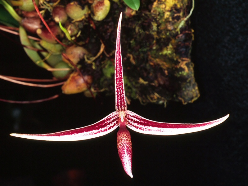 Found in the riverine forests of New Guinea at elevations around 300 meters as a small sized, hot growing epiphyte with clustered, ovoid-conical, longitudinally grooved pseudobulbs carrying a single, apical, lanceolate, acute, apiculate, upper side on either side of the midrib grooved, underneath obtusely prominent, convex, gradually narrowed and conduplicate base leaf and blooms on basal, fascicled, erect, peduncle filiform, 2.2" [5.5 cm] long, 2.24" [6 cm] long overall, single flowered inflorescence with tubular, subulate-acuminate, keeled floral bracts .