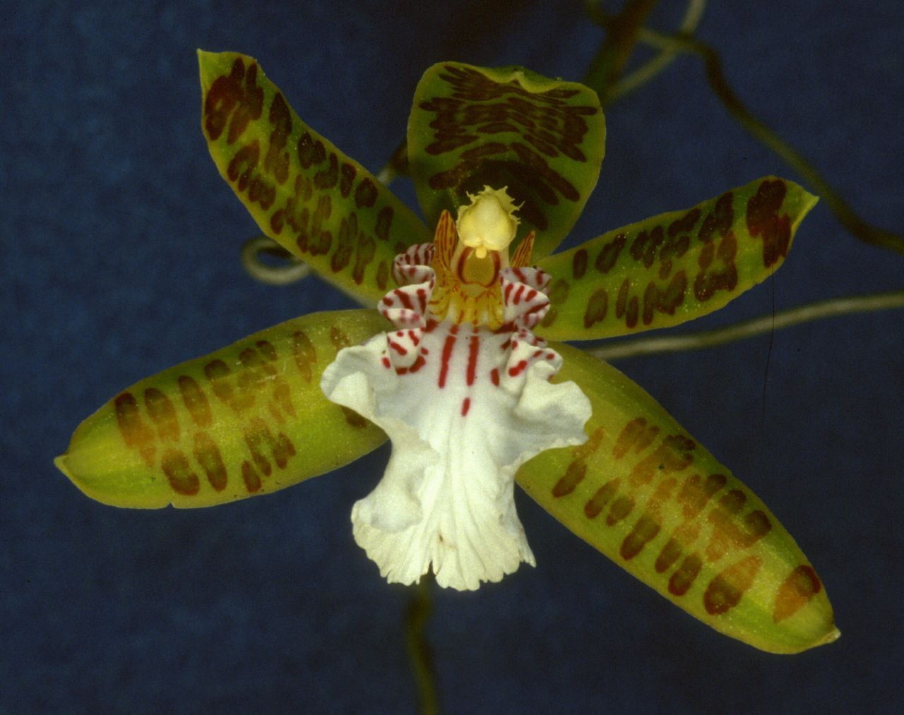 This species is from Ecuador, Peru and Colombia at elevations of 600 to 3000 meters and is a small to medium sized, cold to warm growing, caespitose epiphyte from wet montane forests that needs cool night temperatures, summer shade, high humidity and ample water while growing and a 3 to 4 week rest after blooming to enable the new growth to mature. The small to medium sized plant has 3" ovoid, elongated, psuedobulbs partially enveloped basally by imbricate, acute, scarious sheaths that are tightly packed on a rhizome. They have a single, elongated, elliptic, coriaceous , 4" to 8" [10 to 20 cm] long, conduplicate below into the elongate, petiolate base leaf that has an undulate margin. The many fragrant, long lasting, successive opening flowers occur on a single, occasionally successively 2 flowered, basal, arching to pendant, 3 1/2" [9 cm] long inflorescence arising on a mature pseudobulb and appear in the winter and spring.
