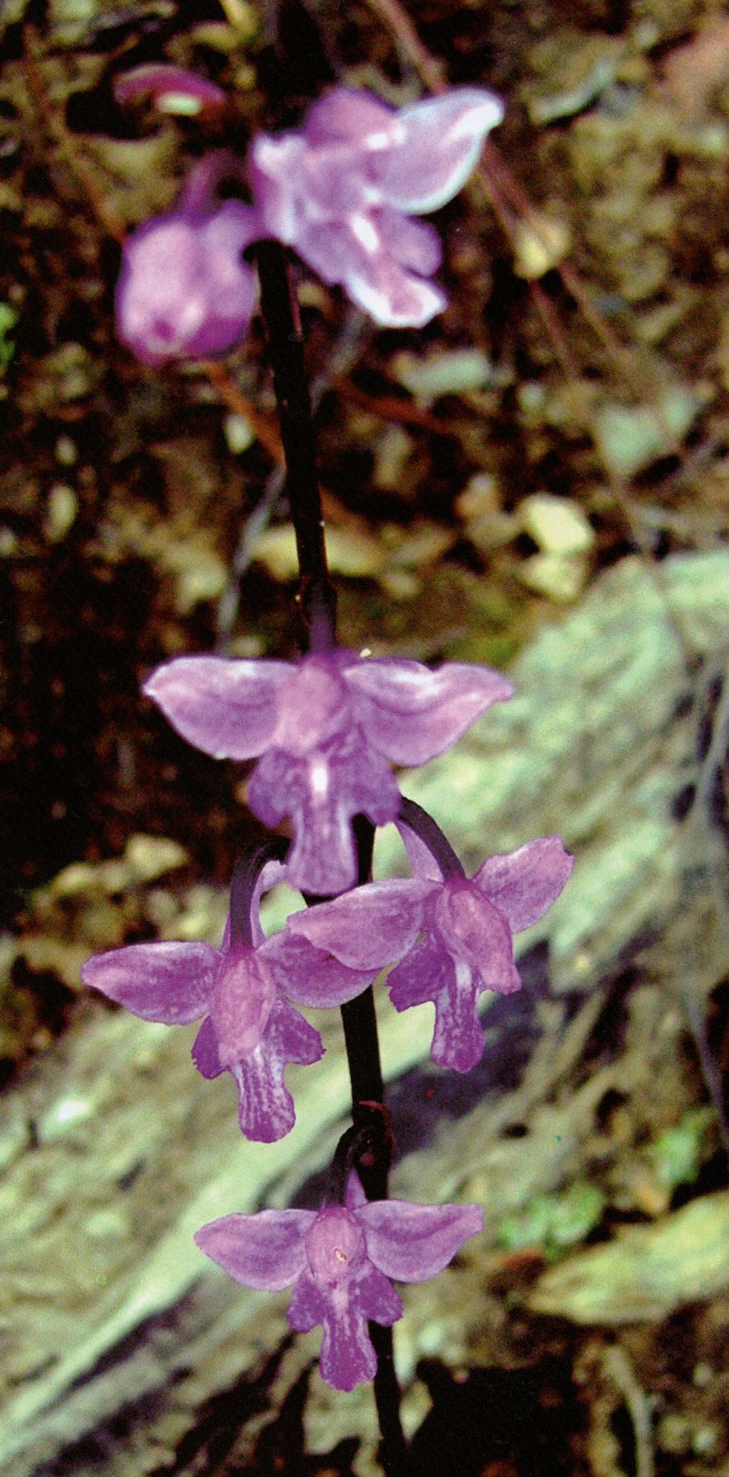Found in China, Taiwan, western Himalayas, eastern Himalayas, Nepal, Bhutan and Myanmar in open hillside in damp hollows around rocks among scrub at elevations of 2500 to 2900 meters as a miniature to small sized, cool to cold growing terrestrial with a cylindrical to ovoid tuber giving rise to an erect stem with lanceolate, acuminate sheaths and carrying broadly ovate-cordate, acute, narrowing below into the clasping base leaves that blooms in the summer on a secund, glabrous, laxly to subdensely, 2 to 5" [5 to 12.5 cm] long, 8 to many flowered inflorescence with ovate to ovate-lanceolate, acute floral bracts.