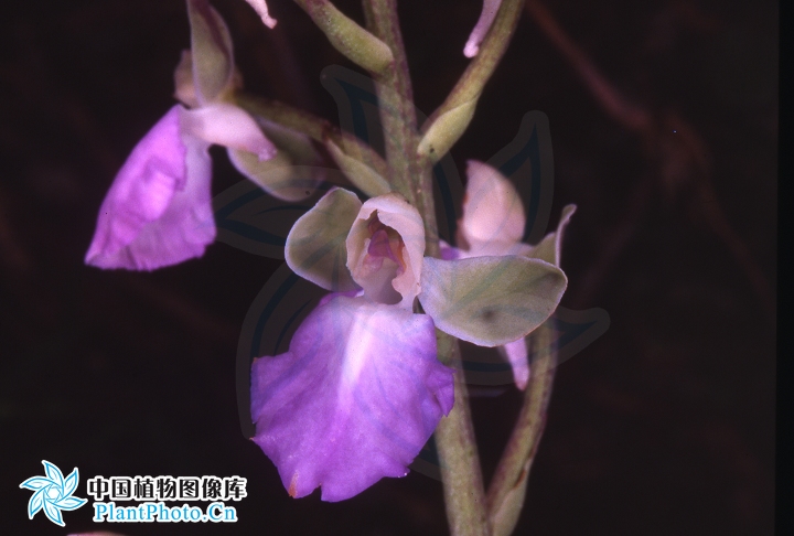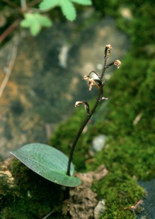 Found in central Guizhou and central to northwestern Yunnan provinces of China in limestone meadows and in grasslands at elevations of 1000 to 1600 meters as a warm to cool growing terrestrial with narrowly oblong-ellipsoid tubers giving rise to a stem with a tubular, basal cataphyl and carrying 1 to rarely 2, ovate, cordate basally, subacute apically leaves that blooms in the summer on an erect, 11.2" [to 28 cm] long, laxly 3 to more than 10 flowered inflorescence with 4 to 9, ovate-lanceolate sterile bracts and ovate-lanceolate floral bracts