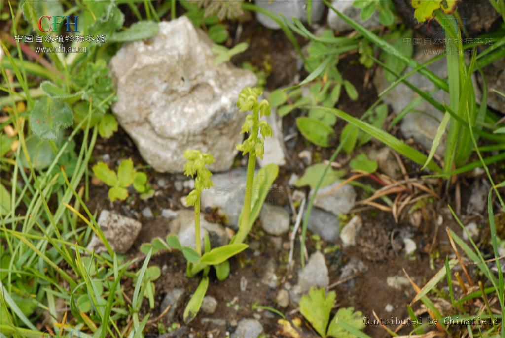 Found in western southern Xizang, Sichuan and northwestern Yunnan provinces of China in alpine grasslands at elevations of 2500 to 4100 meters as a miniature sized, cold growing terrestrial with ellipsoid to subglobose tubers giving rise to an erect stem with 2 to 3, basal, tubular sheaths and carrying 1 to 3, usually 2, basal, subopposite, oblong, elliptic to spathulate, obtuse to acute apically leaves that blooms in the summer on an erect, 1.8 to 7.6" [4.5 to 19 cm] long, cylindric, ebracteate, laxly few to subdensely many flowered inflorescence with ovate, shorter than the ovary, obtuse floral bracts and carrying nodding flowers