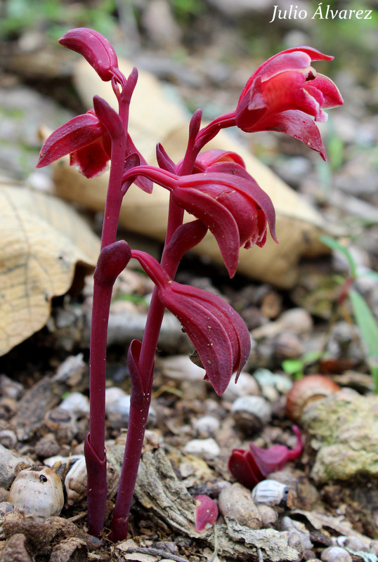 Found in Mexico in pine/oak forests at elevations around 1750 meters as a small sized, cool growing mycoheterotrophic terrestrial with coral white rhizomes giving rise to an erect, dark purple to dark red, succulent, enveloped below by tubular, obtuse, inflated bracts, to 12” [30 cm] long overall, blooming in the later summer, rachis 4” [10 cm] long, laxly, 3 to 5 flowered inflorescence carrying campanulate, dark purple flowers