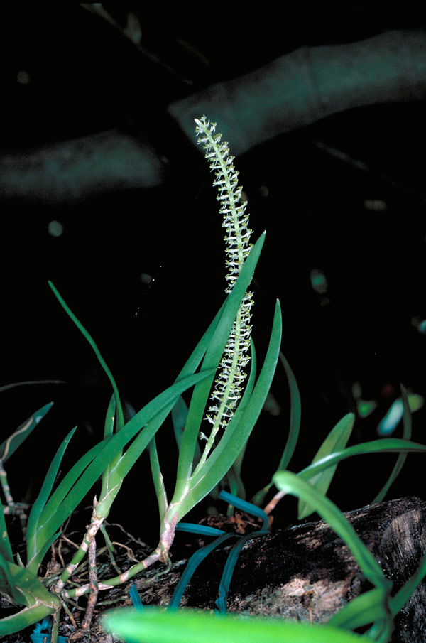 P>An equitant monopodial, epiphytic species found in Papua and New Guinea that always is found in deep shade and on the trunks of moss free rough barked trees where it blooms on an axillary, erect, long, densely many flowered, racemose inflorescence.