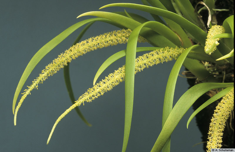 Found in Malaysia, Borneo, Java, Sulawesi? and Sumatra in lowland and riverine forests on rough barked, moss-free tree trunks at elevations around 50 meters as a small to just medium sized, hot growing epiphyte with a short stem carrying 4 to 6, two-ranked, laterally compressed, linear, acute, placed at an acute angle to stem and others, lower small, upper larger leaves that blooms on a terminal, pendulous, 20" [50 cm] long, densely many flowered inflorescence with lanceolate, acute floral bracts and carries non-resupinate flowers