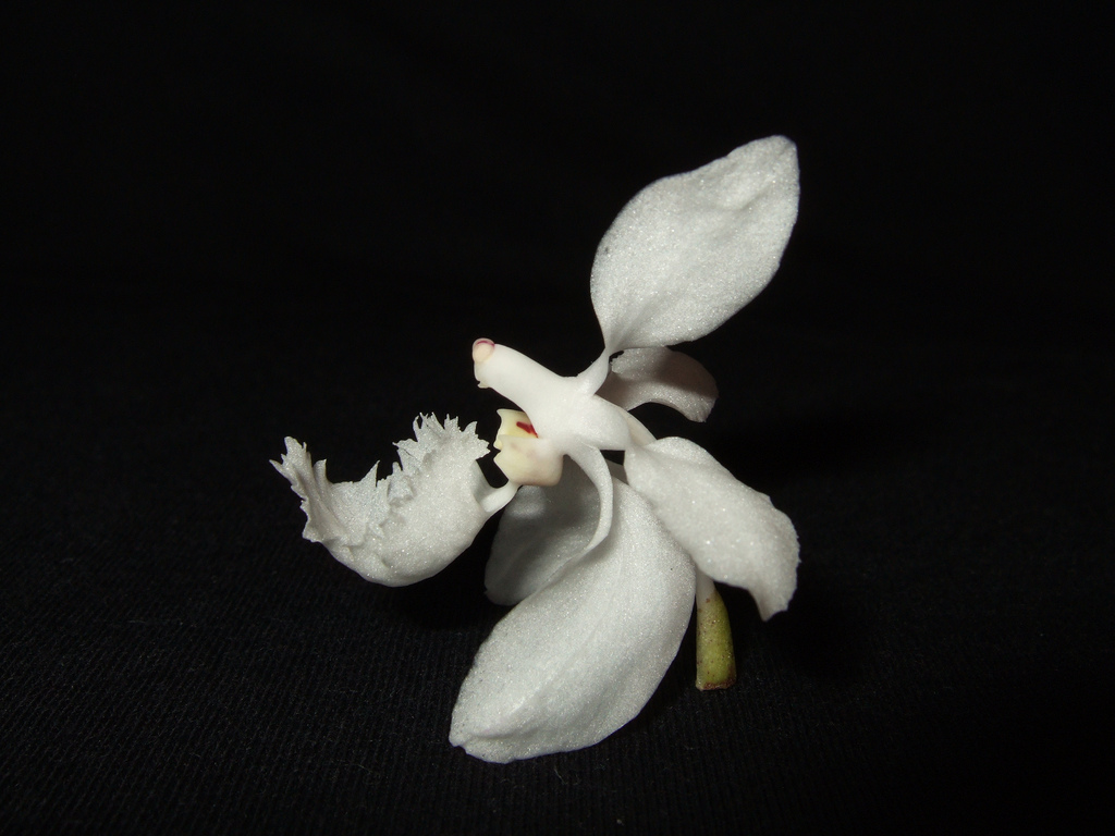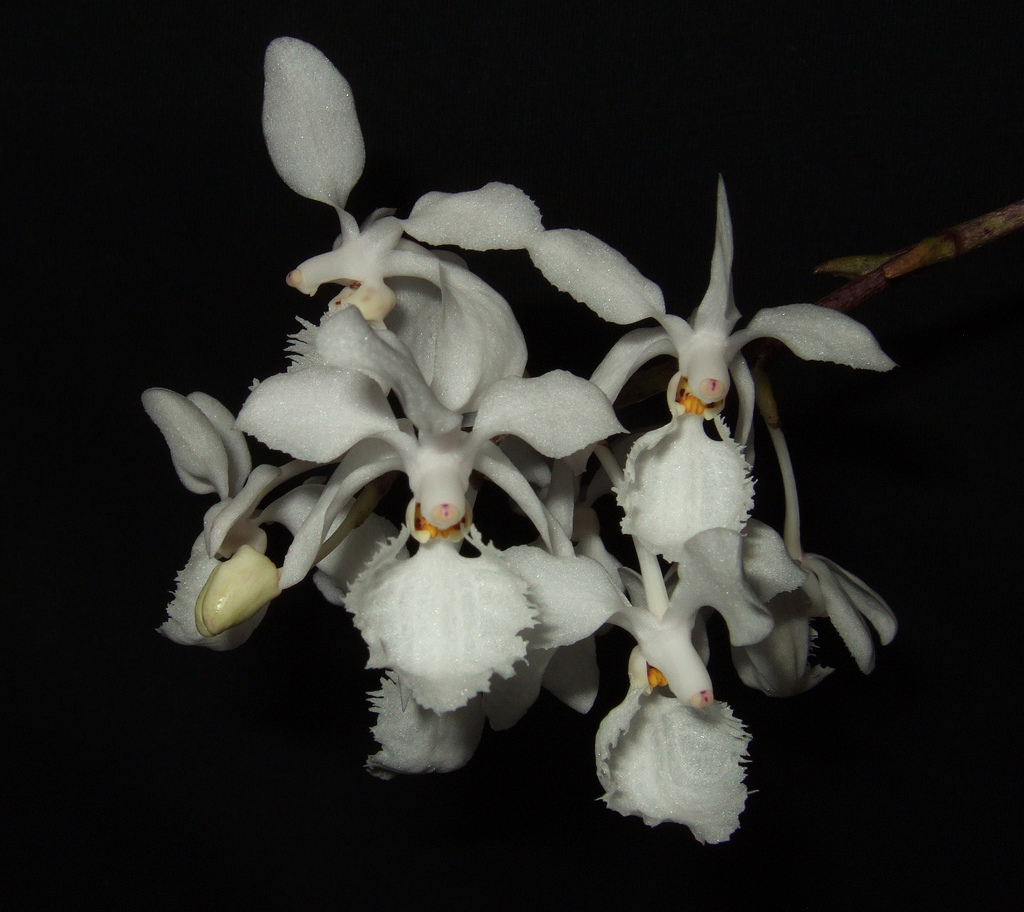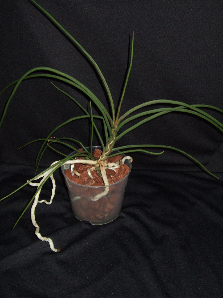 Found in southeastern Yunnan province of China in broad leaved, evergreen forests at elevations sround 2300 meters as a miniature to small sized, cold growing epiphyte with stems carrying 3 to 5, nearly terete, fleshy leaves that blooms in the spring on an axillary, ascending to arching, to 5.6" [14 cm] long, several flowered inflorescence.