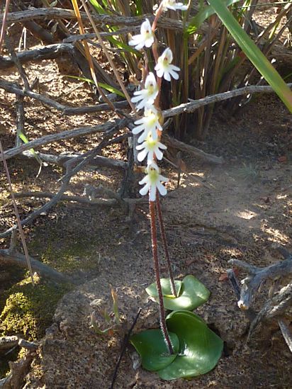 Found in western and southwestern Cape Province South Africa in rocky places among scrub at elevations of 150 to 900 meters as a miniature to small sized, cold growing terrestrial with a minutely and thinly hairy stem carrying 2, basal, adpressed to the ground, hairless, orbicular, cordate basally leaves that blooms in the winter on an erect, terminal, lax, 3 to 13 flowered inflorescence.