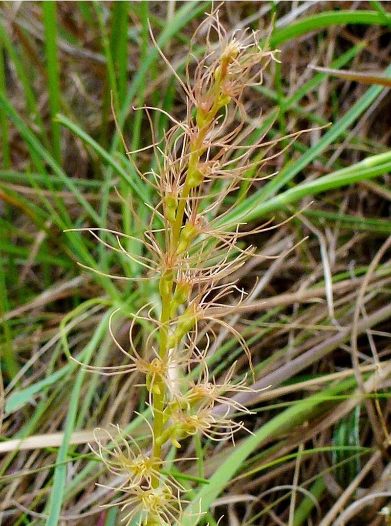 Found in southwesern and southern Cape Province of South Africa in grasslands as a small to medium sized, cold growing terrestrial with a basally single, ground-hugging, ovoid to orbicular, cordate, wavy edged, glabrous leaf that blooms in the winter and spring on a bracteate, shortly refelexed hairy, 6 to 20" [15 to 50 cm] long, many flowered inflorescence carrying dimorphc flowers.