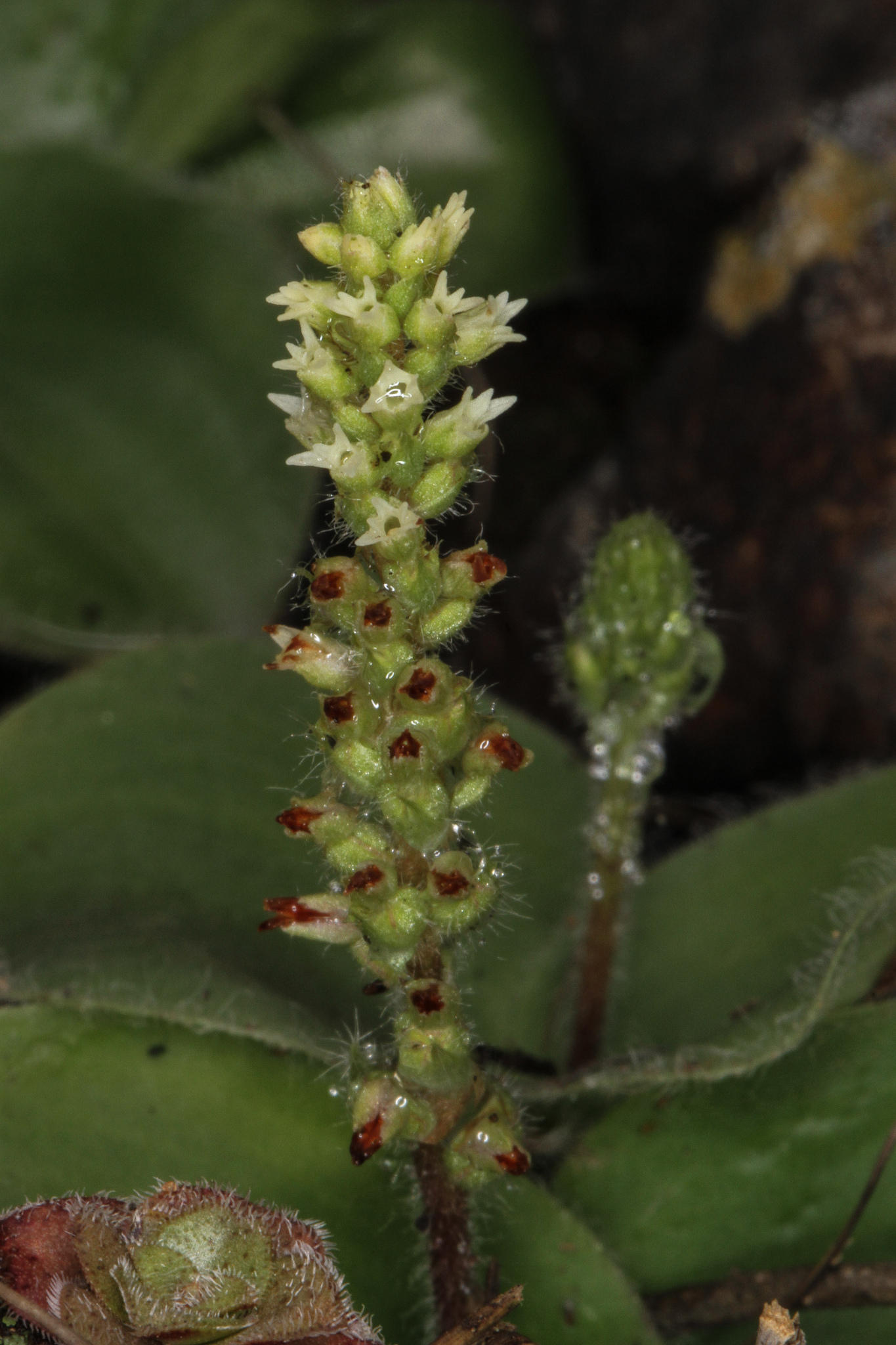 Found in Natal Province of South Africa in cracks in vertical sandstone cliffs as a mini-miniature to miniature sized, cold growing lithophyte with a slender, hairy stem carrying 2 basal, ovate, hairy, green at flowering time leaves that blooms in the late spring and early summer on an erect, secund, to 2.2" [5.5 cm] long, 15 flowered inflorescence with ovate-lanceolate, hairy floral bracts.