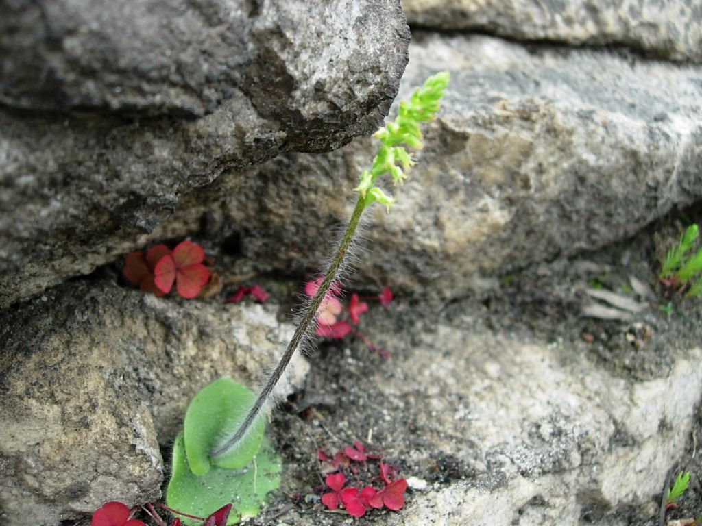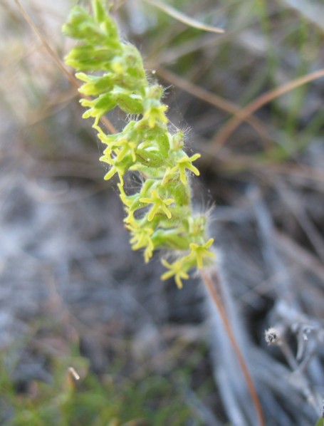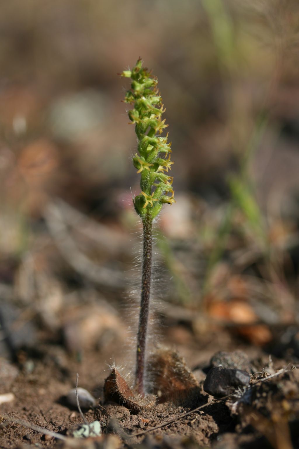 Found in Zimbabwe, Cape Province South Africa and Reunion on grassy slopes at elevations of sealevel to 1900 meters as a miniature to small sized, cold growing terrestrial with ovoid, villous tubers giving rise to an erect, sheathless scape with 2, adpressed to the ground, cordate, pilose above leaves that blooms usually without leaves in the late winter through spring on an erect, 1.6 to 2.8" [4 to 7 cm] long, spreading hairy, fairly densely many [30 to 50] flowered inflorescence with secund, non-resupinate [most often] flowers
