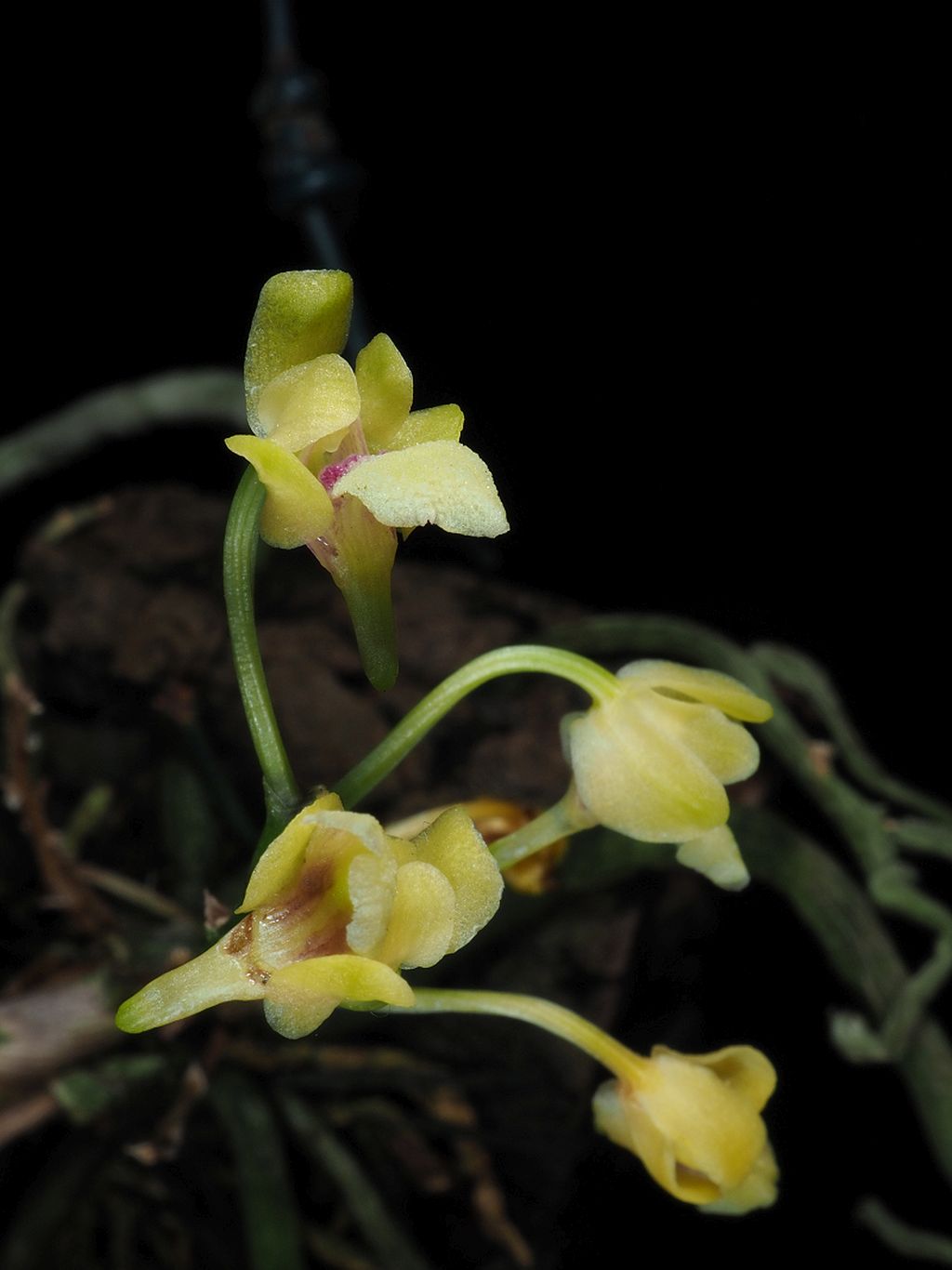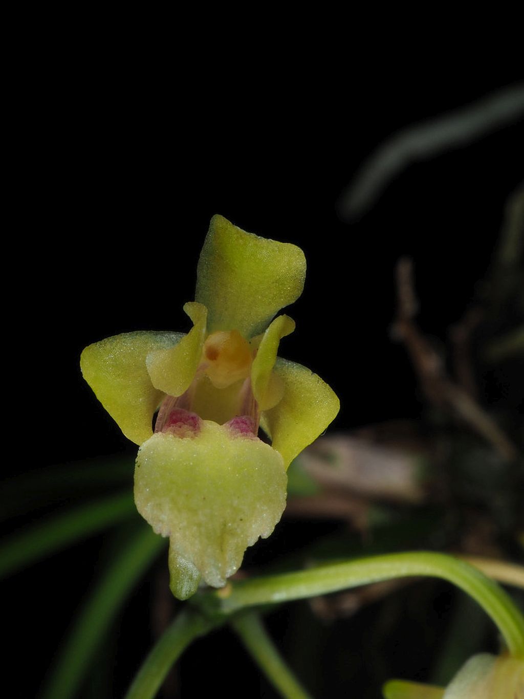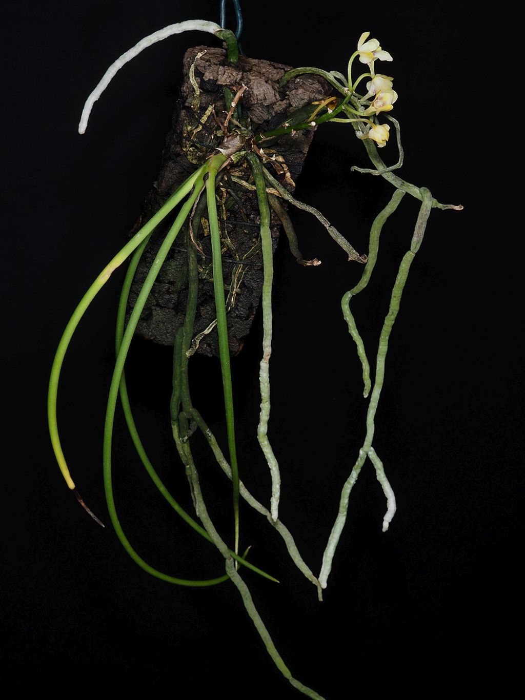 Found in southern Vietnam in dry evergreen, coastal, tropical, monsoon rainforetests at elevations of 50 to 150 meters as a miniature sized, hot growing epiphyte with a short, unbranched, erect stem enveloped by loosely adpressed, imbricate, distichous, more or less rigid leaf sheaths carrying 3 to 5, distichous, rigid, subulate, canaliculate below, terete towards the apex, acute, recurved to arcuate to slightly flexuous, articulate basally, suddenly broadening at the base into the sheath leaves that blooms in the winter and early spring on an axillary, racemose, peduncle green, erect, rigid, .8 to 2" [2 to 5 cm] long, provided with 1 to 3, short, small, broadly triangular, obtuse, sterile bracts, rachis rigid, .8 to 2.4" [2 to 6 cm] long, distant, 1 to rarely 14 flowered inflorescence with small, erect, triangular to broadly ovate, acute, longer than the ovary floral bracts and carrying resupinate, shallowly campanulate to widely opening flowers.