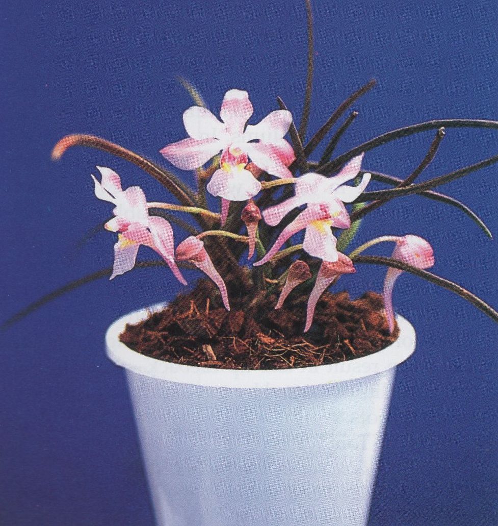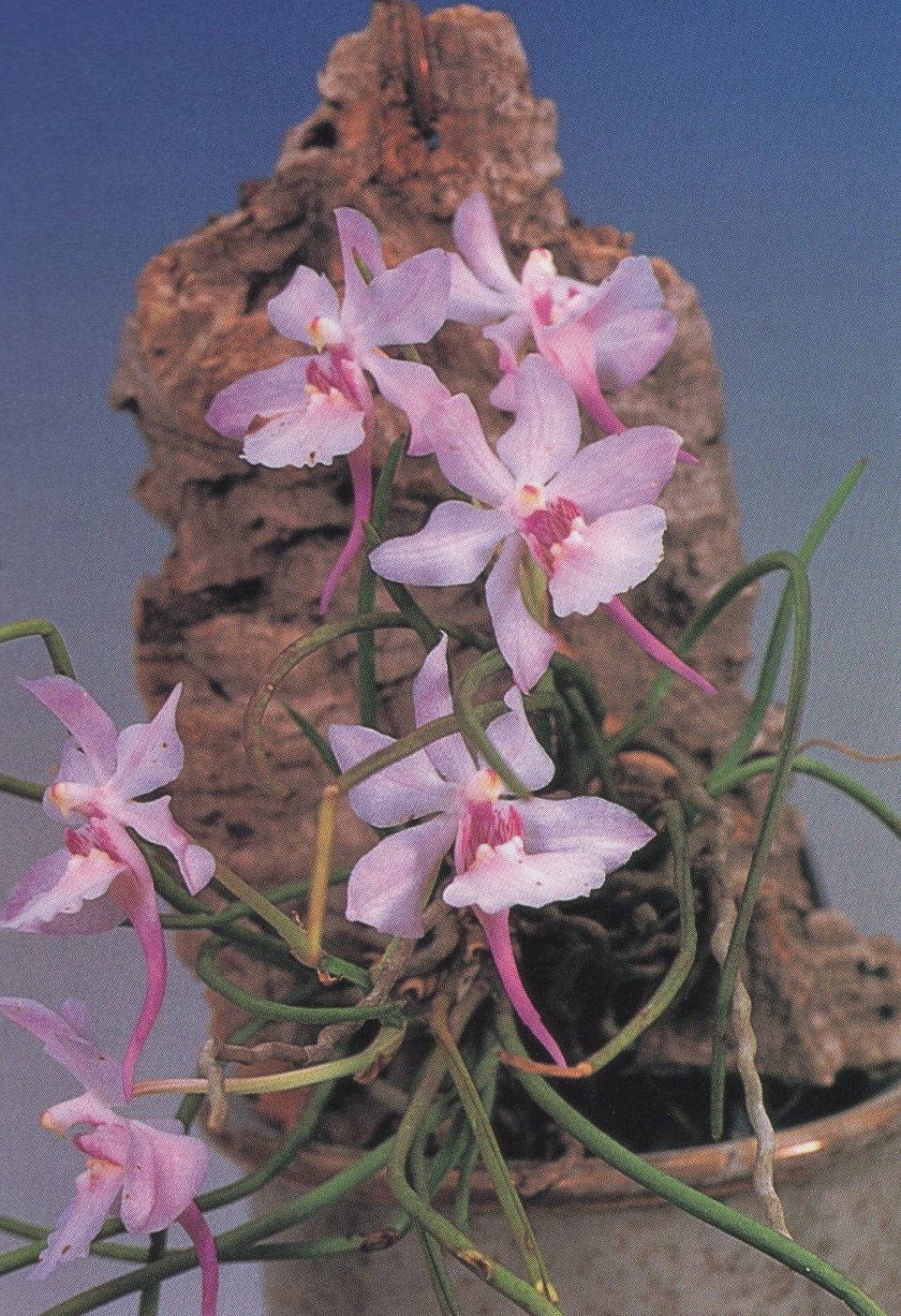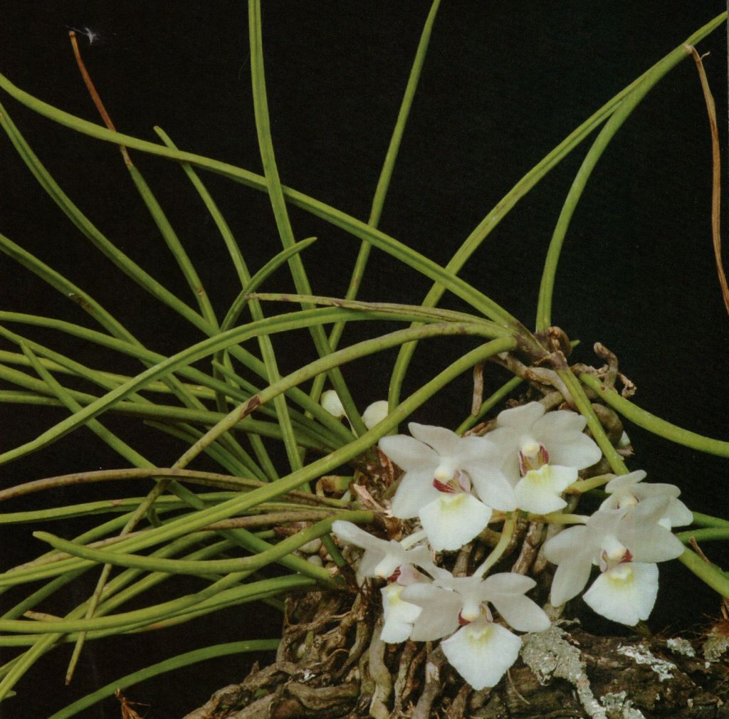Found in northwestern Yunnan province of China in mixed forests at elevations of 2000 to 2400 meters as a small to medium sized cool to cold growing lithophyte with an erect stem carrying many, terete, fleshy, acuminate leaves that blooms in the late spring on an ascending, 2 to 4" [5 to 10 cm] long, 2 to 10 flowered inflorescence with several ovate sheaths and persistent, ovate floral bracts.