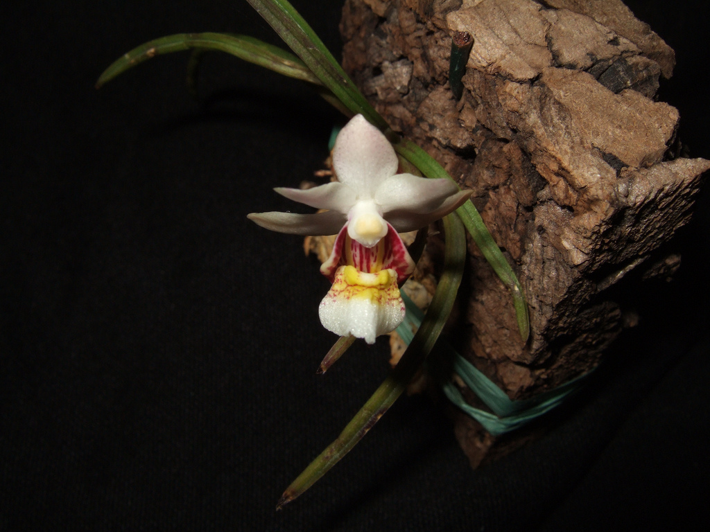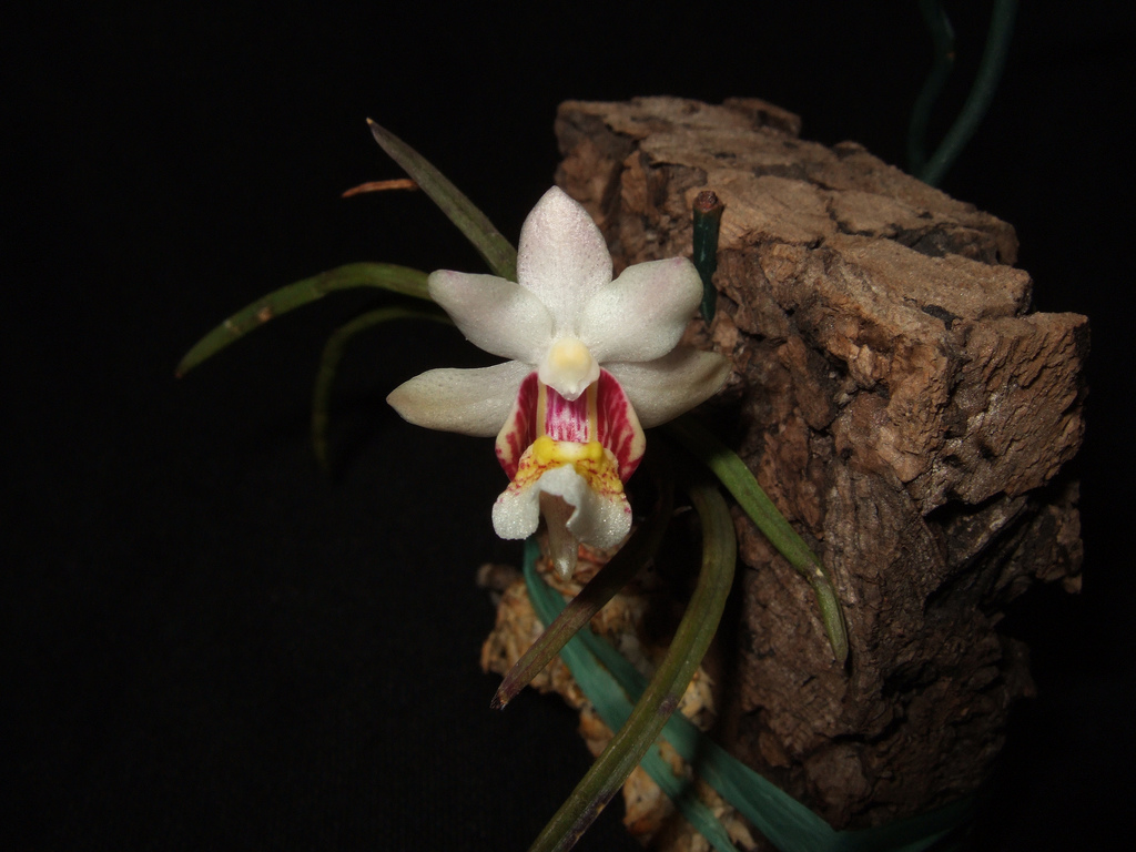 Found in Yunnan province of China in broad-leaved forests on tree trunks at elevations of 2500 to 3000 meters as a miniature to small sized, cold growing epiphyte with a pendulous, short stem carrying many nearly basal, subterete, fleshy acuminate leaves that blooms in the spring on a short, 1 to 5 flowered inflorescence with ovate floral bracts.