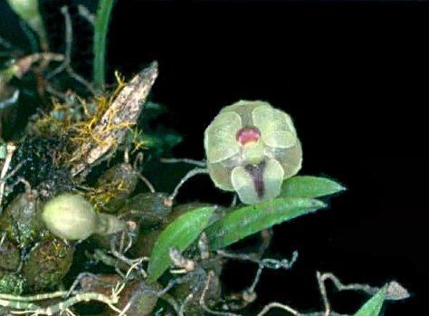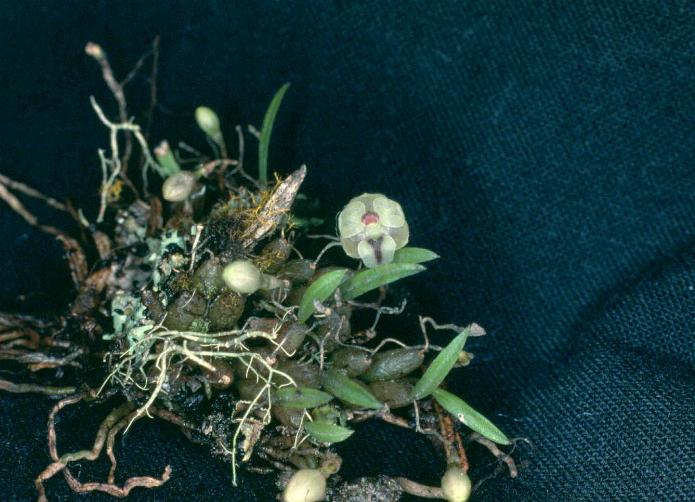 Found in San Luis Potosi, Guerrero and Hidalgo states of Mexico as a mini-miniature sized, cool growing epiphyte at elevations of 1400 to 1500 meters with, clustered, small, ovate pseudobulbs carrying a single, apical, linear-lanceolate leaves and flowers in the summer on a slightly fractiflex, terminal, single flowered inflorescence with 5 to 6, inflated, tubular bracts .