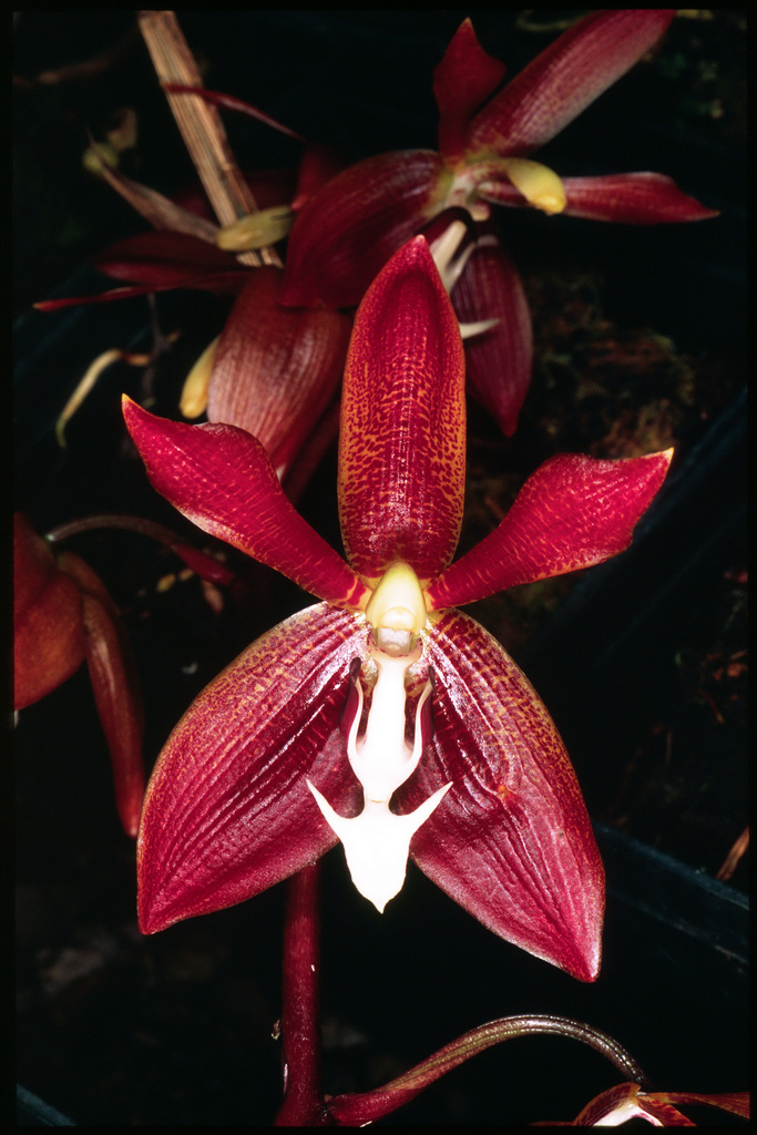 Found from Panama, Guyana, Surinam, Venezuela, Colombia, Ecuador, Peru and Brazil on shaded slopes in wet montane forests at elevations of 1000 to 2000 meters as a medium to large sized, cool to hot growing, unifoliate terrestrial with ovoid-pyriform, lightly compressed, acute angled edge pseudobulb that is almost enveloped by a basal sheath with a single, narrowly lanceolate, plicate, 7 ribbed leaf with a channeled petiole at the base that blooms on a robust, erect, basal, 1 1/2' [45 cm] long, dull purple mottled with green, racemose, several to many flowered inflorescence with a fractiflex rachis, arising on a mature pseudobulb, with 5 to 12, waxy, long-lasting, fragrant flowers occuring in the late summer and fall.