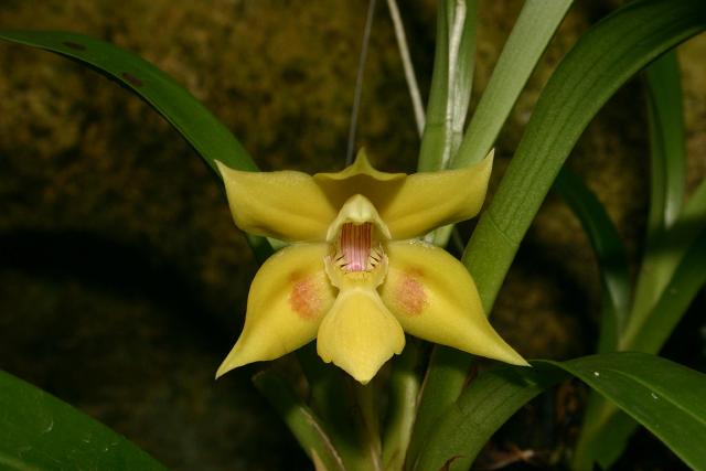 Found in the department of Narino Colombia and Ecuador in western facing lowland rainforest slopes at an elevations around 200 to 230 meters as a small sized, hot growing epiphyte with a loose fan of narrowly elliptic, acute, gradually narrowing below into the conduplicate base leaves that are articulated to the sheaths below that clasp the short stem and blooms in the spring on an axillary, erect, 1 1/4" [3 cm] long, single flowered inflorescence holding the flower at the base of the leaves.