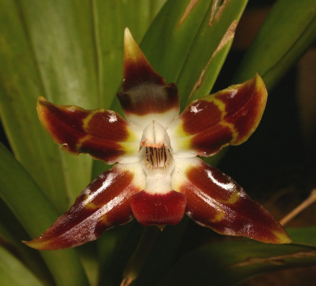 Found in Guyana, Venezuela, Ecuador and Brazil in lower, extremely wet, montane cloud forests at elevations of 500 to 1100 meters as a small sized, hot growing epiphyte with no pseudobulbs and no intervening rhizome, each fan-shaped growth comprises of thin, not floppy, light green, smooth, lightly veined, plicate leaves that blooms in the summer and fall on one per leaf axil, erect, axillary, terete, pale green, to 6" [15 cm] long, single flowered inflorescence arising on a newly developing growth, with 2 together, outspread winglike, acuminate bracts below the middle