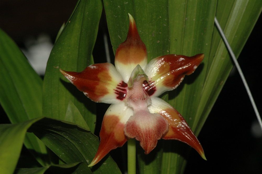 Found in Peru in wet montane forests at elevations of 300 to 1500 meters as a small to just medium sized, hot to warm growing epiphyte with a fan of narrowly elliptic leaves that bloom in the spring on an axillary, 8" [20 cm] long, single flowered inflorescence
