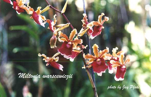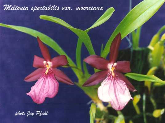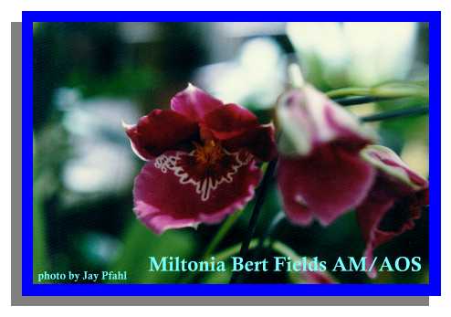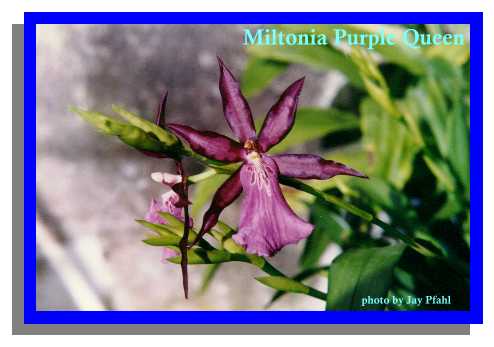 Miltonia Is a natural genus with ten species ranging through Brazil and into Peru. They have 1 or 2 leaves on the psuedobulb with leaflike sheaths from which the inflorescence arises having non spured flowers with free sepals and petals, a large flat lip, basically no callus, a footless column and 2 hard pollina. They perform well in pots or they can be mounted to tree fern. They are a part of the Oncidium Alliance and are often used in breeding.