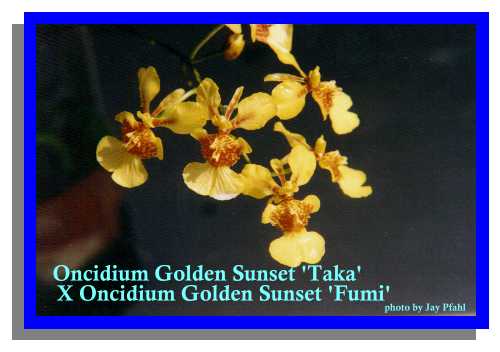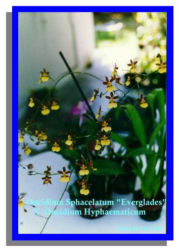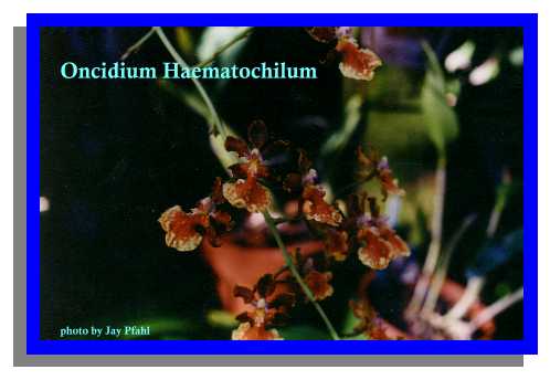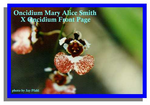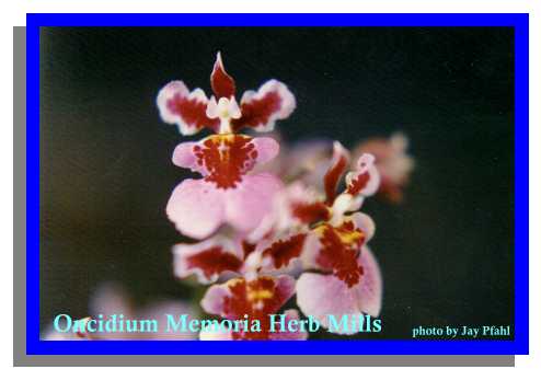 Oncidium Almost 600 species make up the natural genus distinguished by 1 or 2 leafed flattened psuedobulbs usually subtended by distichous leaflike sheaths where the inflorescence emerges from their axil. The flowers are spurless, with the basal part of the lip spread from the column which has no foot, and often with elaborate wings on either side of the stigma. Oncidiums can be epiphytes or more rarely grow on embankments and terrestrially, where they can enjoy any of the four climes depending on the specific environment for that species. There are many potting factors as well but most can adapt to pots, wood mounts, and wood slat baskets. The Oncidium alliance, which includes Odontoglossum, Brassia, Aspasia, Miltonia, Leochilus and many others are intercrossed often in orchid cultivation and are most likely the third most common cultivated orchid after Cattleyas and Dendrobiums.