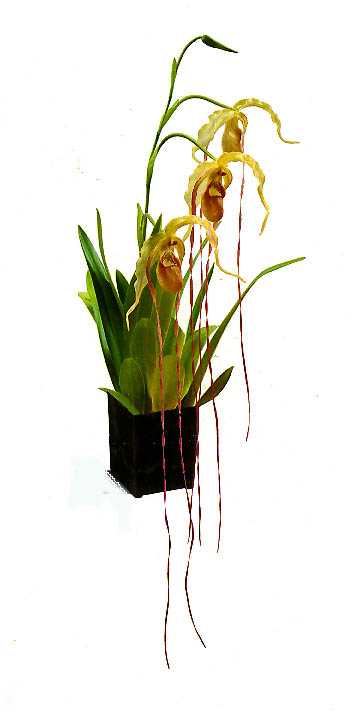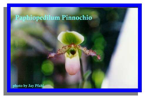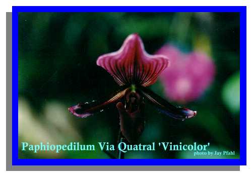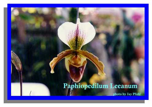 The flower parts of Paphiopedilum are distinctly different than others with it's pouch like lip {#3 in photo} hanging below the sheild shaped "staminode" {#4 in photo} in the center of the flowers and on to the bizarre hairs warts and bumps of the linear petals {#2 in the photo}, and up to the cowl-like upper or dorsal sepal {#1 in the photo}. Sixty some species are found in Southern India to New Guinea and the Philippines. They are also related to our terrestrial Cypripediums of North America, commonly known as lady's slippers. They are best grown in pots with a wood media.