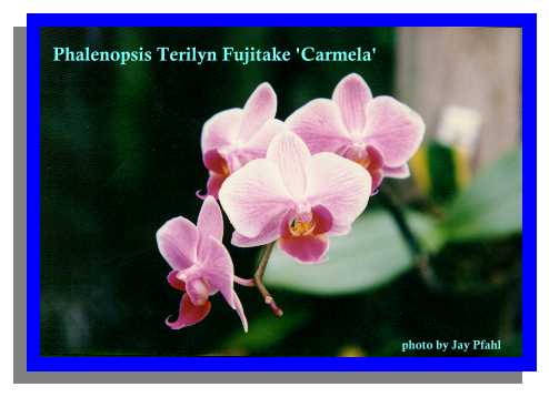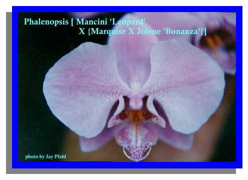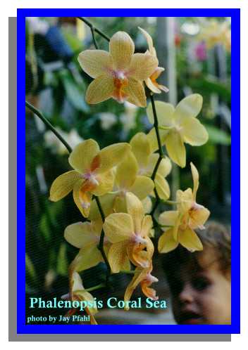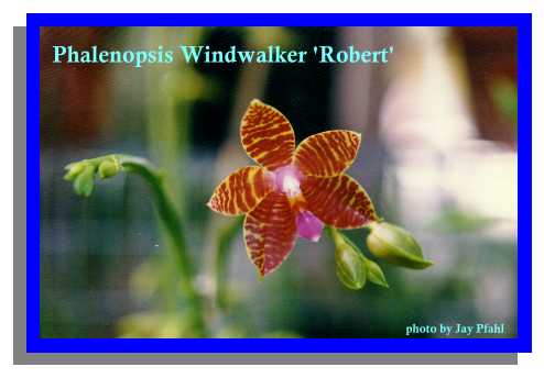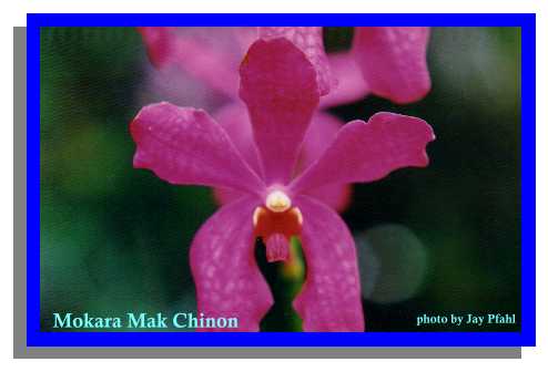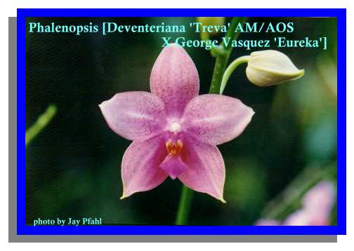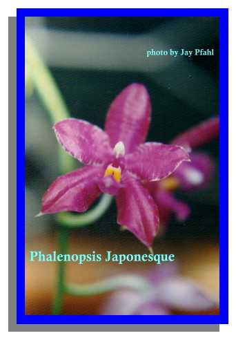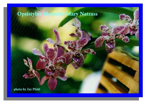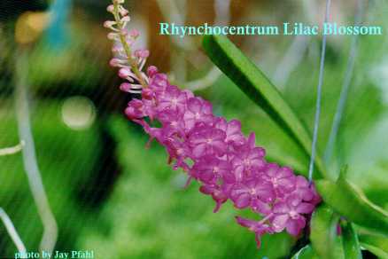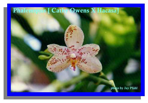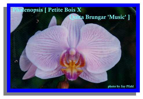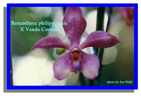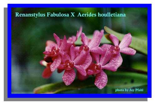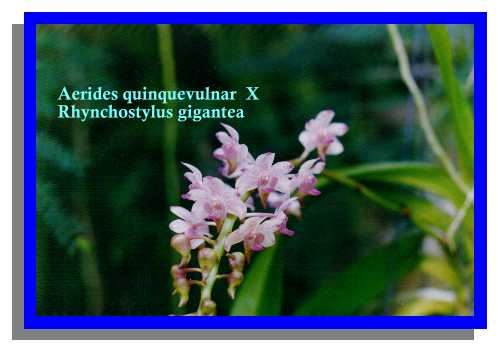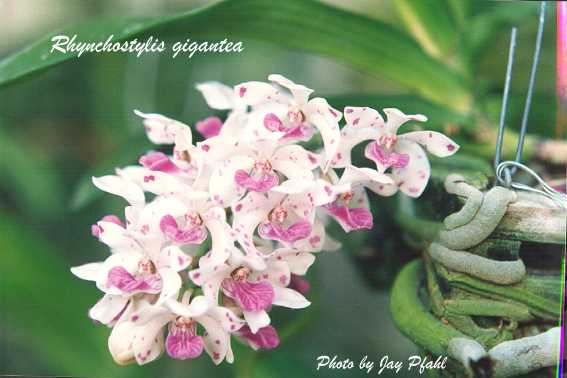 Phalenopsis This is a natural vandanaceous genus comprised of 50, mostly epiphytic and some lithophytic species spread throughout most all of Asia east of India and the Pacfic to the Philippines and south to Australia. It is monopodial with large succulent, drooping leaves with short stems, giving rise off the stem from among the leaves to an inflorescence which can have a few to a hundred flowers with a distinct 3-lobed clawed lip. Renanstylus Renanthera and Rhynchostylus are the progentitors of this hybrid genus.