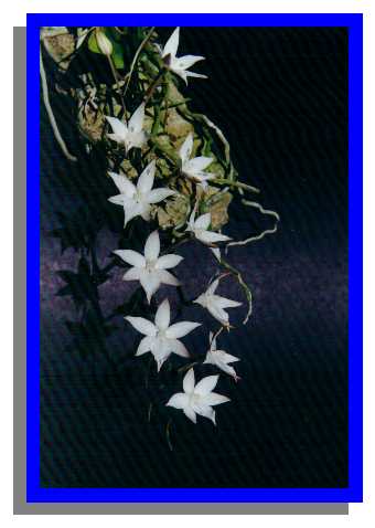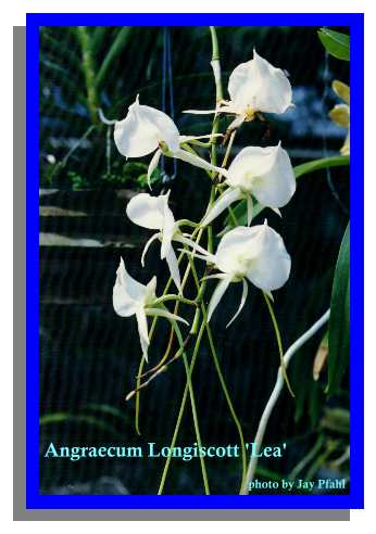 Angraecum This is a natural genus with the majority of the species come from Africa. They like wood slat basket culture but appreciate a bit more medium in the basket than most Vandanaceous plants. They are characterized by a long spur or nectary on the back of the flower and more often than not are pure white in color.
