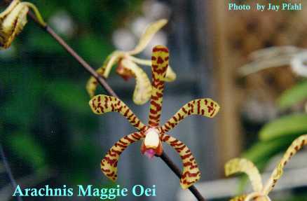 Arachnis Arachnis is a natural genus that appreciates lots of direct sunlight and likes to grow up the side of a tree for support. They can become quite tall, up to 50 feet so they need to be specially accomodated. They can be grown in wood slat baskets and bloom variably year round.