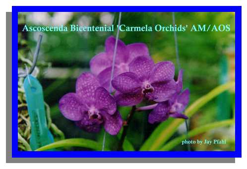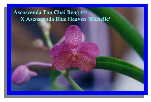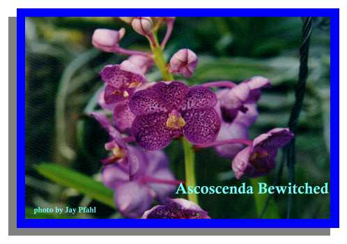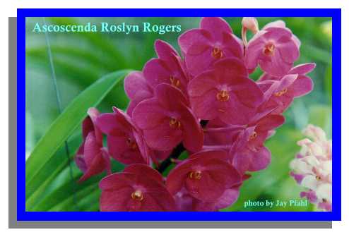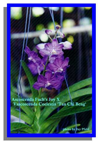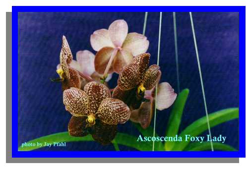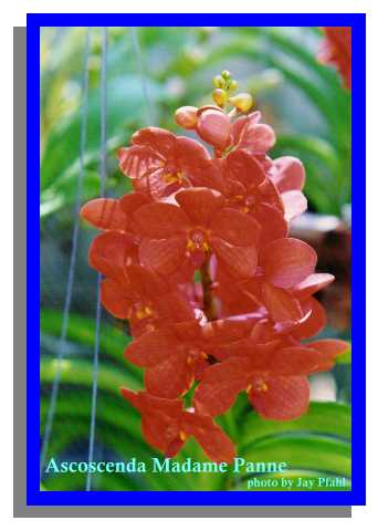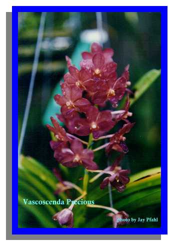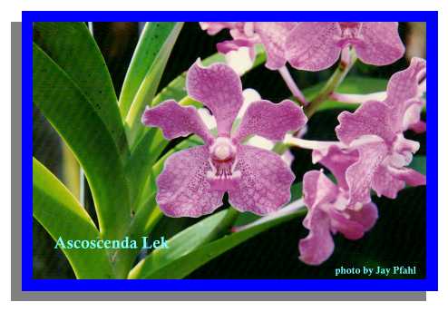 Ascoscenda This genus arises from the crossing of the genera Ascocentrum and Vanda. This genus is more variable in it's light requirements and does best in wood slat baskets.
