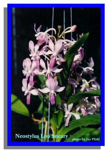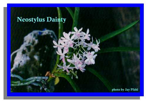 Neostylus This genus is the product of crossing Neofinetia and Rhynchostylus creating minature plants with fragrant blooms. They grow well in warm conditions with steady water, bright light and fertilizer.