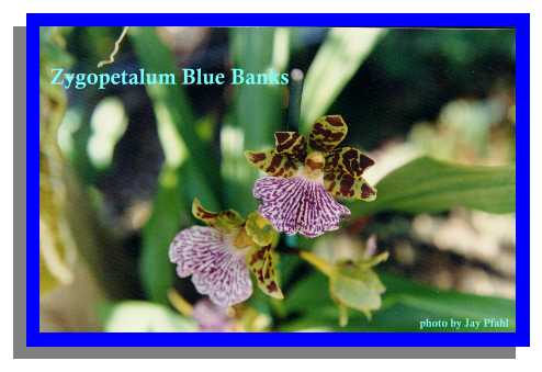 Zygopetalum Blue Lake and John Banks are crossed to make this hybrid registered in 1991 by Los Osos.