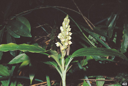 Found in Taiwan in rainforests in shady damp locations at elevations of 100 to 400 meters as a small to medium sized, hot to warm growing terrestrial with an ascending, black to purplish brown stem carrying 3 to 6, abaxially pale green, adaxially dark green and glossy, obovate to elliptic, acuminate to acute, obtuse below into the petiolate base leaves that blooms in the summer on an erect, reddish brown, sparsely pubescent, 2 to 4" [5 to 10 cm] long, several flowered inflorescence with reddish brown, abaxially pubescent, ovate-lanceolate to lanceolate, slightly longer than the pedicel and ovary, acuminate floral bracts.